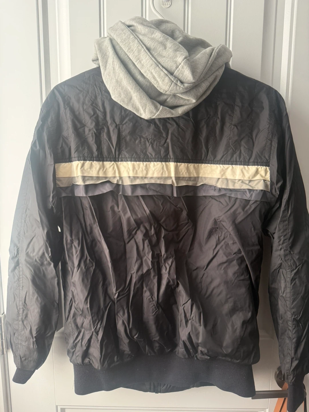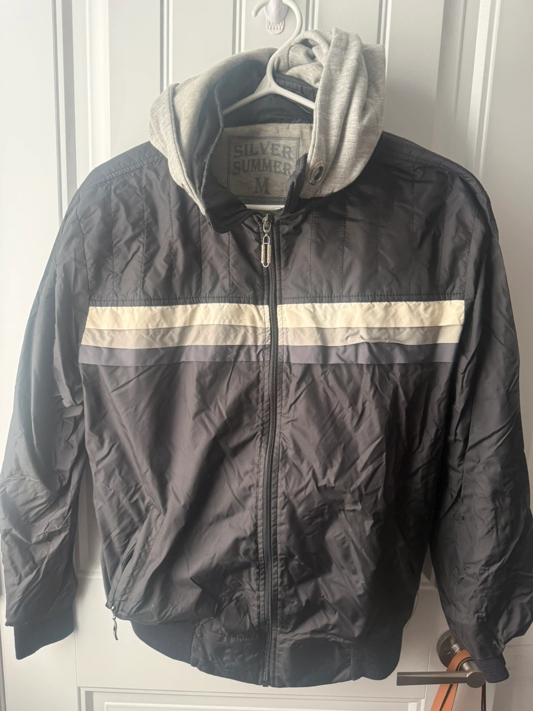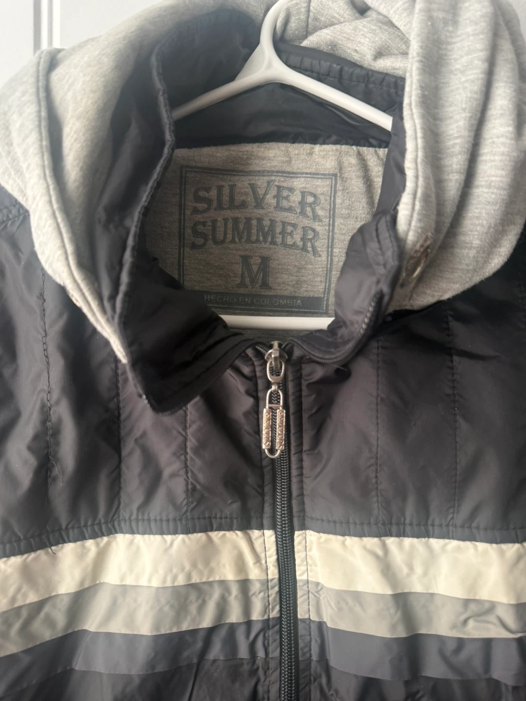 This black Silver Summer jacket features a grey hood and a sporty stripe design across the chest. It's a size medium, perfect for layering during cooler weather. The jacket has zippered pockets for convenience.