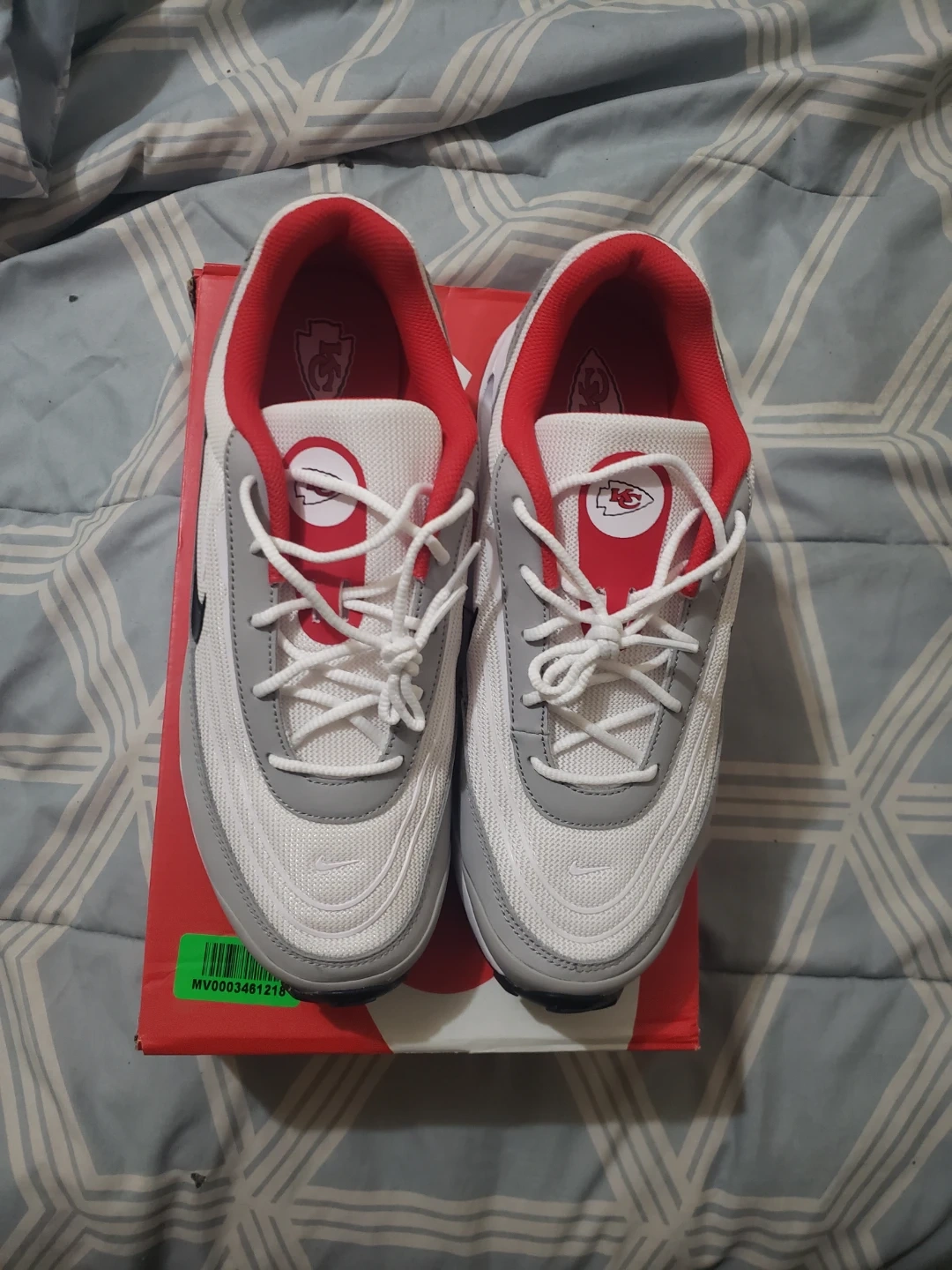 These Nike Air Max 97 sneakers come in white, grey, and red. They feature the Kansas City Chiefs logo on the tongue and inner sole. Includes the original box. Perfect for any Chiefs fan!