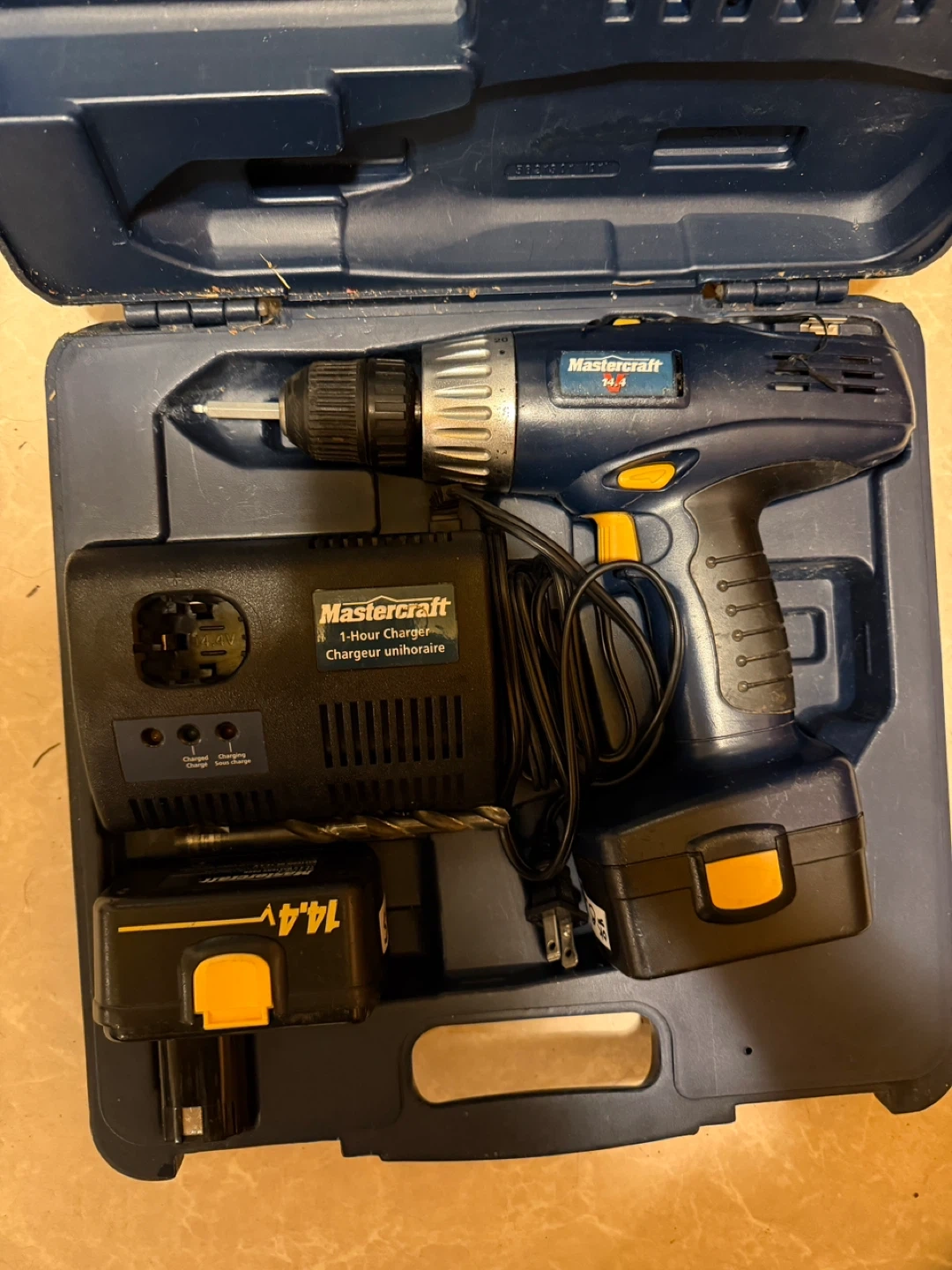 Mastercraft 14.4V cordless drill kit. It's a blue and silver drill with a black grip. Includes a "1 Hour Charger" and a 14.4V All stored in a blue Mastercraft carrying case.
