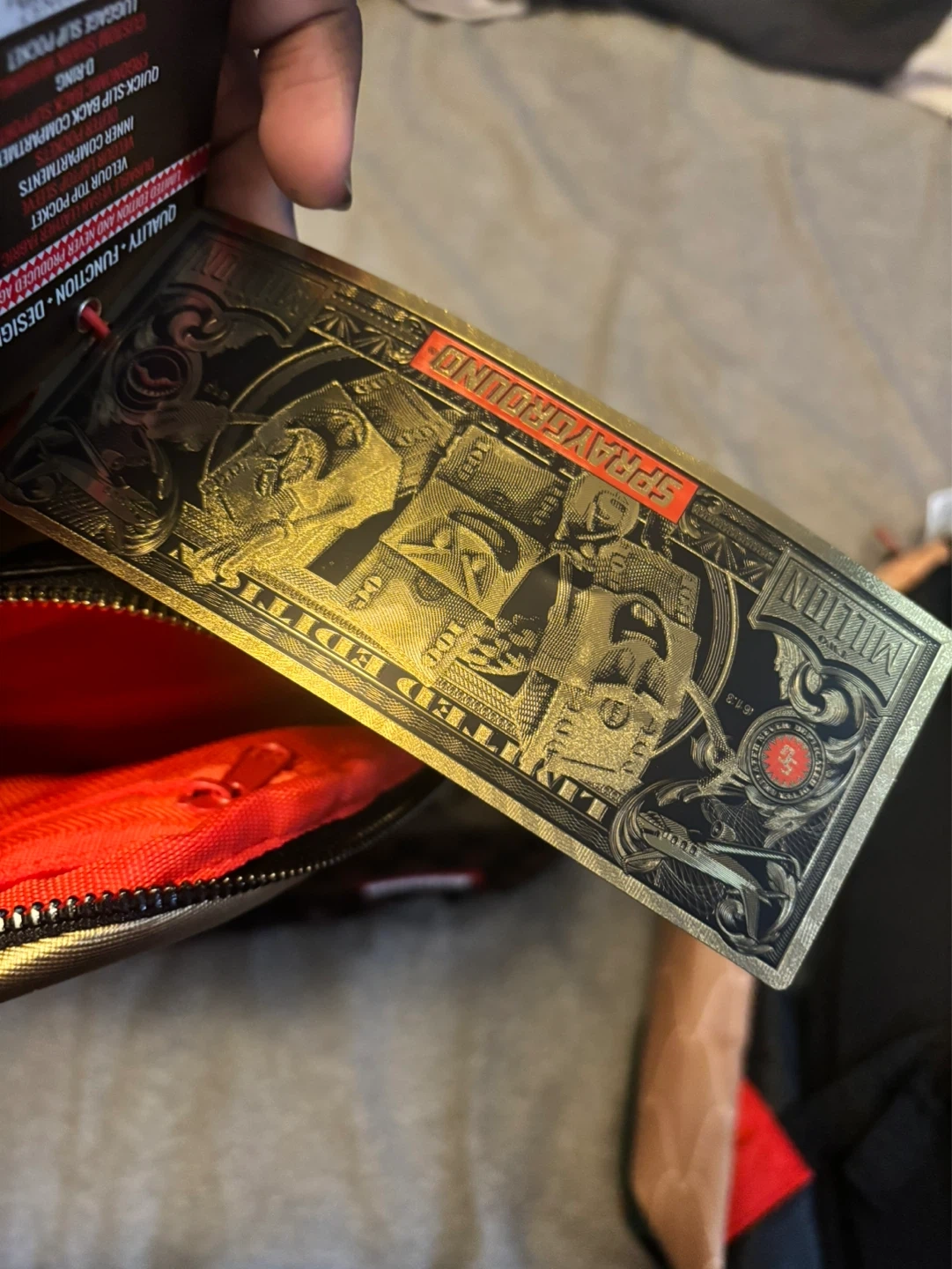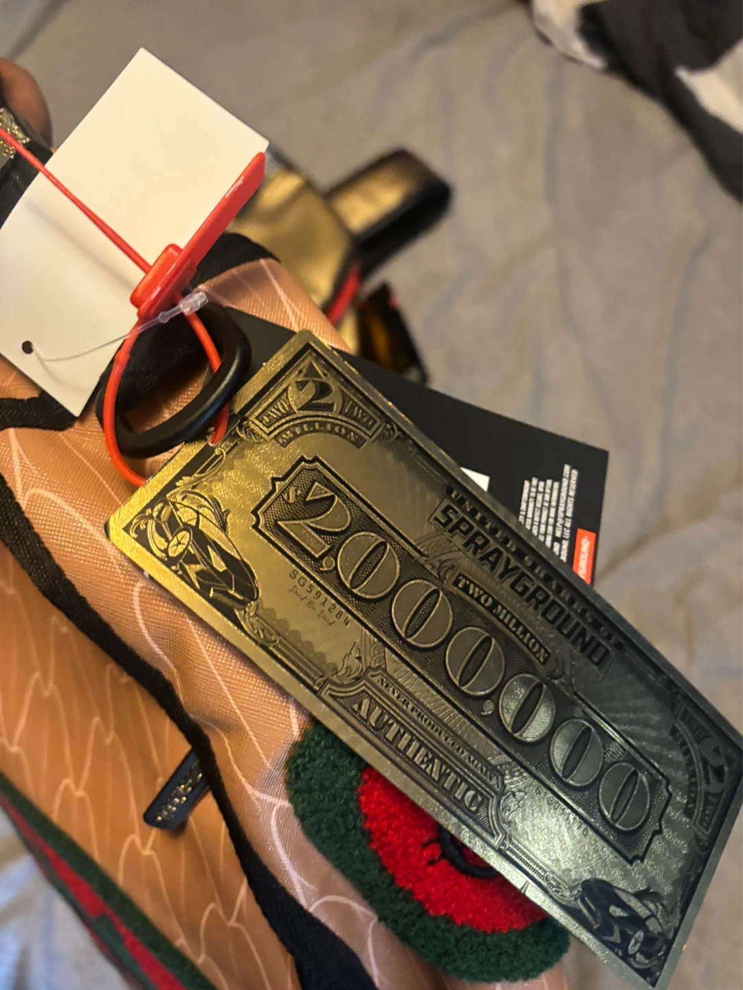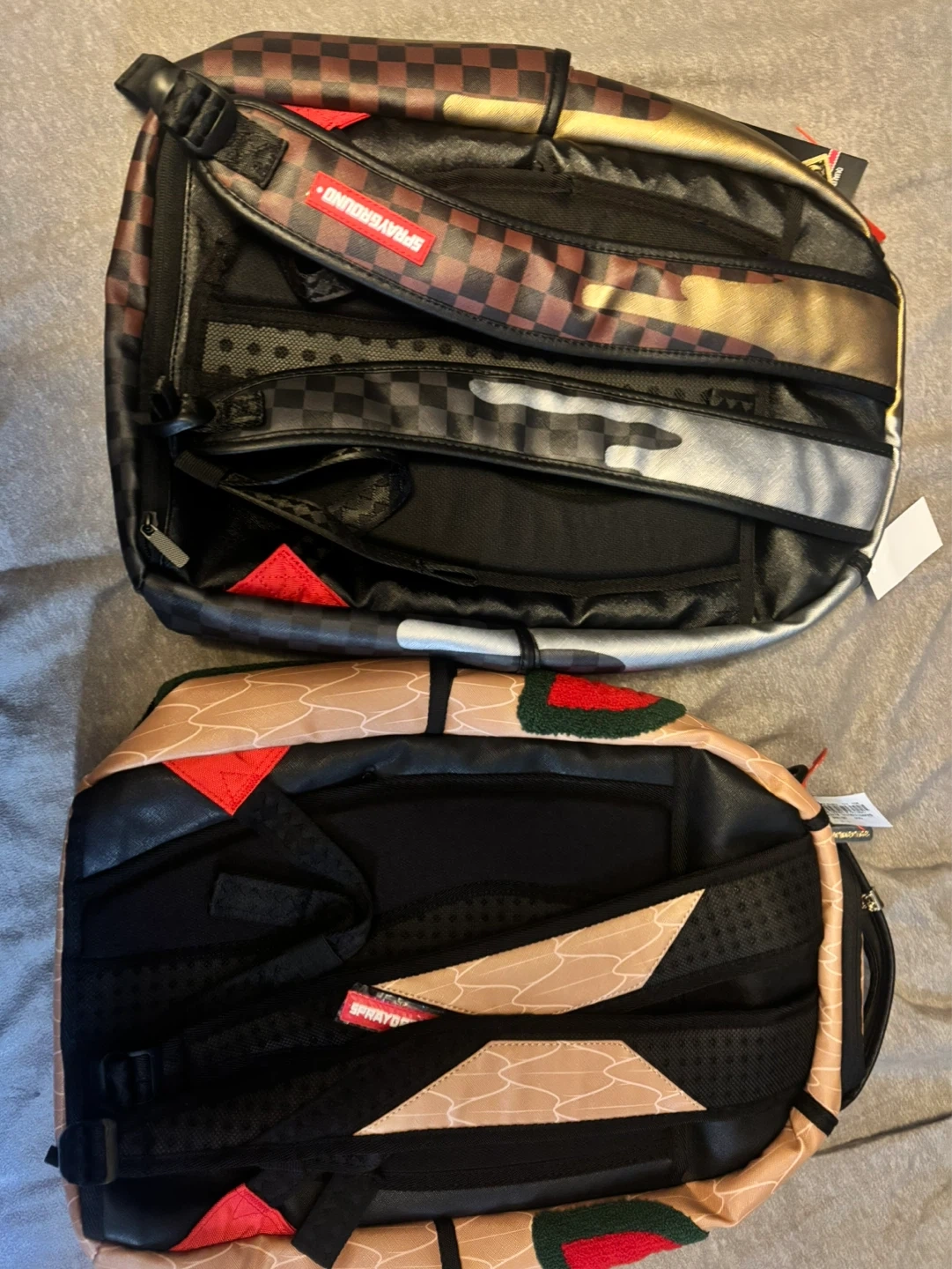 Two Sprayground backpacks with distinct patterns. Both are limited edition. One features a checkered and drip design, the other a desert wave pattern. Both have red interiors and prominent Sprayground branding.