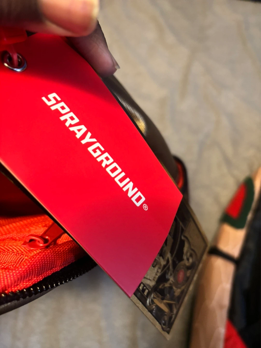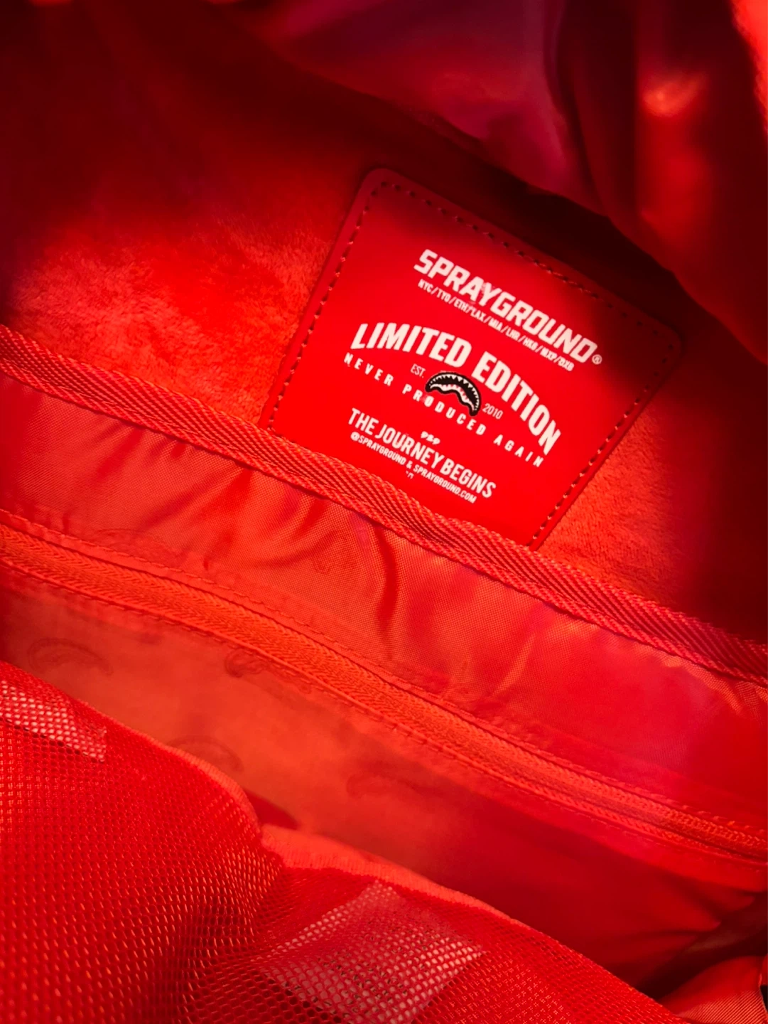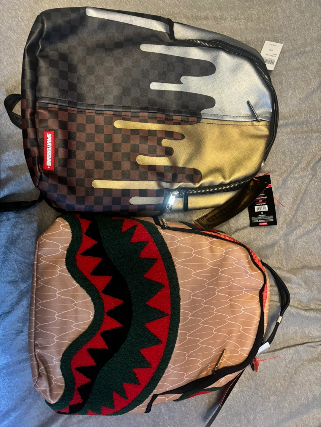 Two Sprayground backpacks with distinct patterns. Both are limited edition. One features a checkered and drip design, the other a desert wave pattern. Both have red interiors and prominent Sprayground branding.