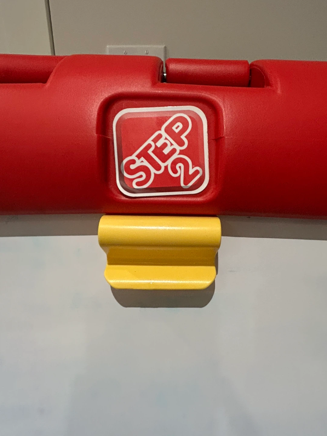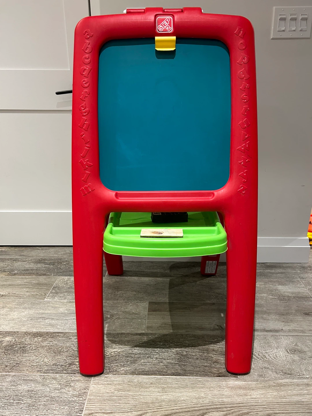 Selling a Step2 easel that's perfect for kids! It's in great shape and ready for a new home. It features a red and green frame with a magnetic whiteboard on one side and a chalkboard on the other. There's also a handy tray for storing art supplies. There are clips on each side to hang paper and colouring pages so kids have more options to paint or colour.