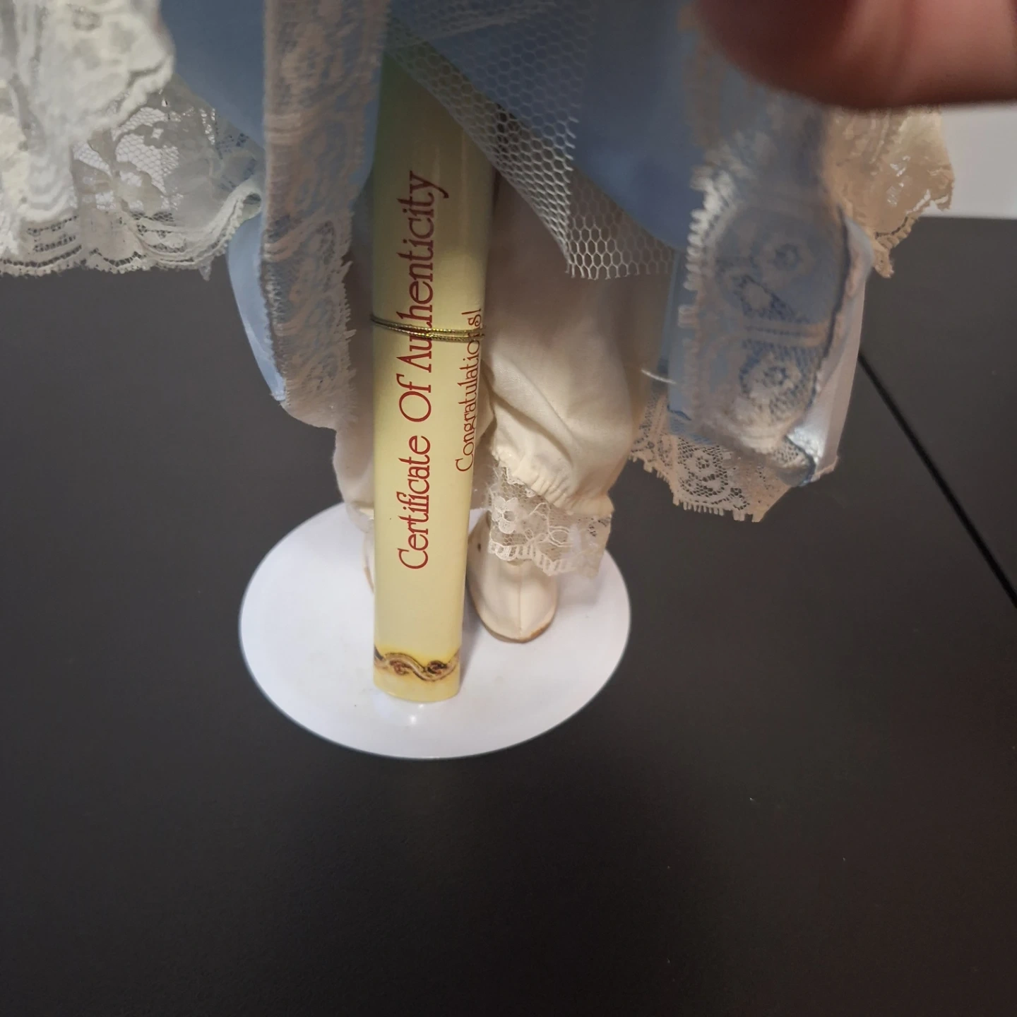 This is a lovely decorative porcelain doll wearing a blue and lace dress. It comes with a certificate of authenticity. The doll's intricate detailing makes it a beautiful display piece.