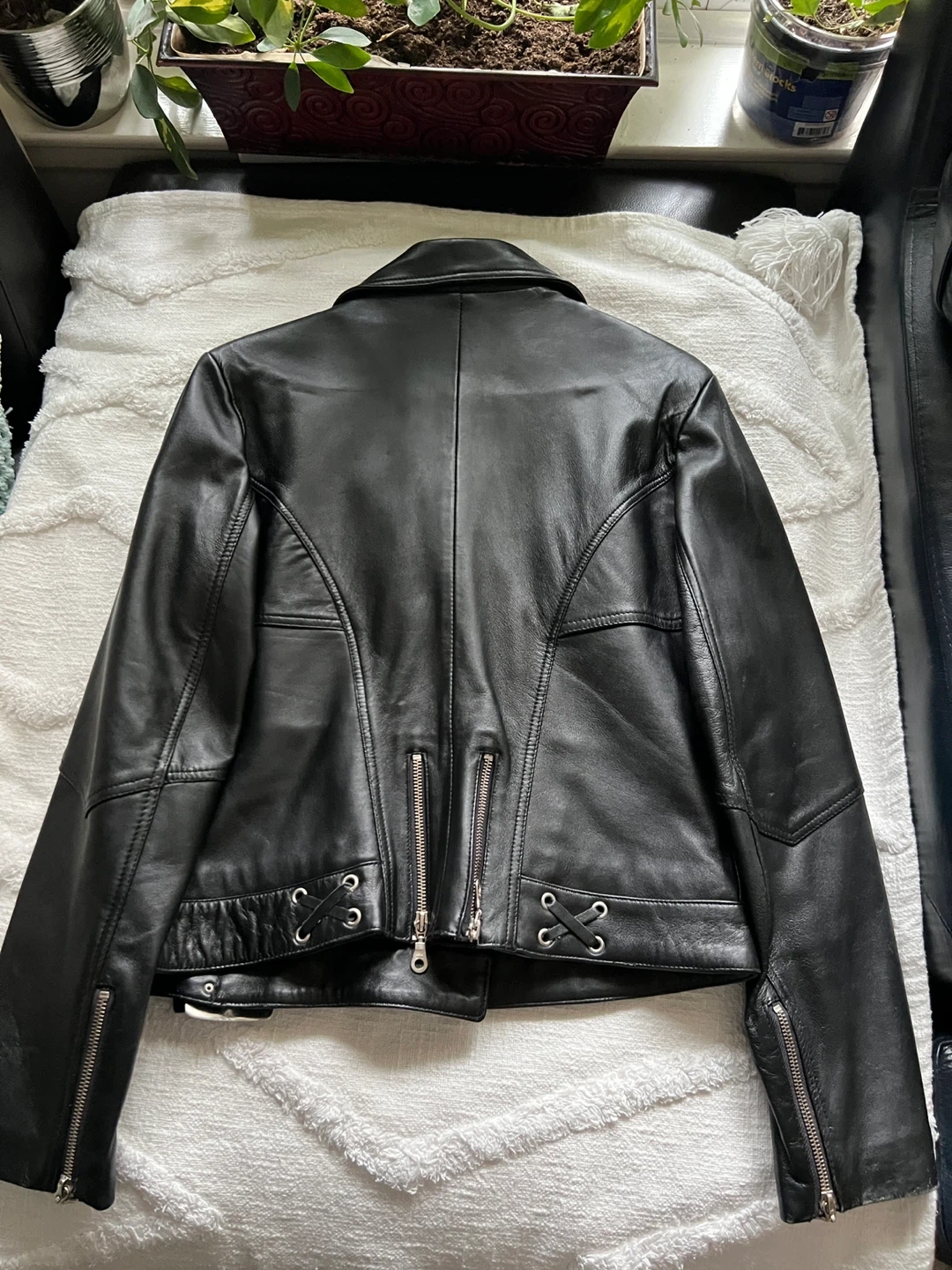 Classic black biker jacket from ZEBRA LEATHER. Made from genuine leather with silver hardware. Features zippered pockets and a buckled waist. Perfect for a stylish look!
