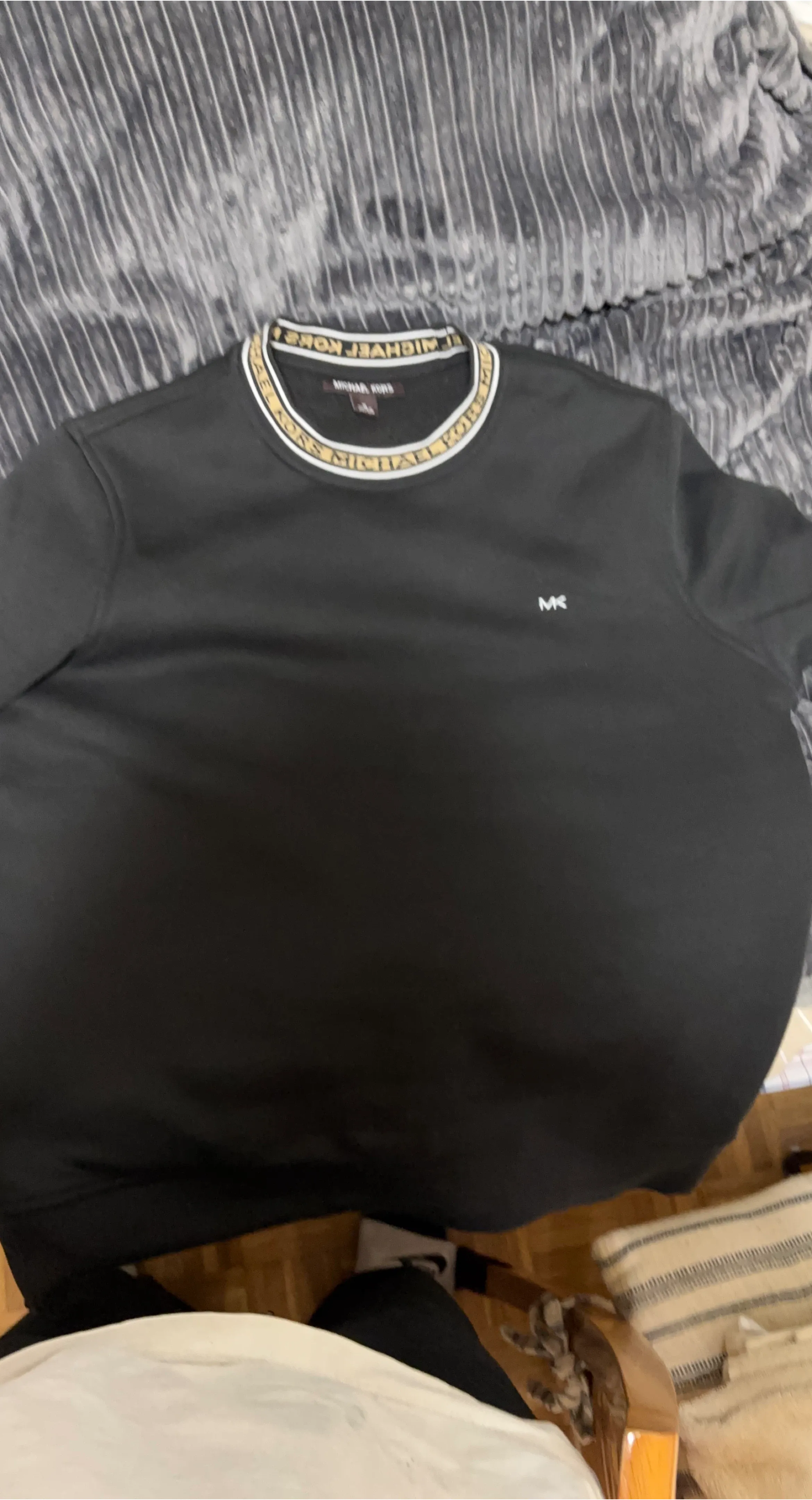 Michael Kors black crewneck sweatshirt. It has a white and gold logo trim around the collar. Features a small MK logo on the chest. It's a comfortable and stylish piece.