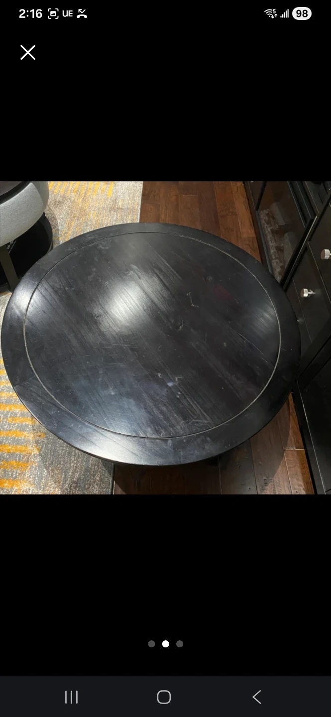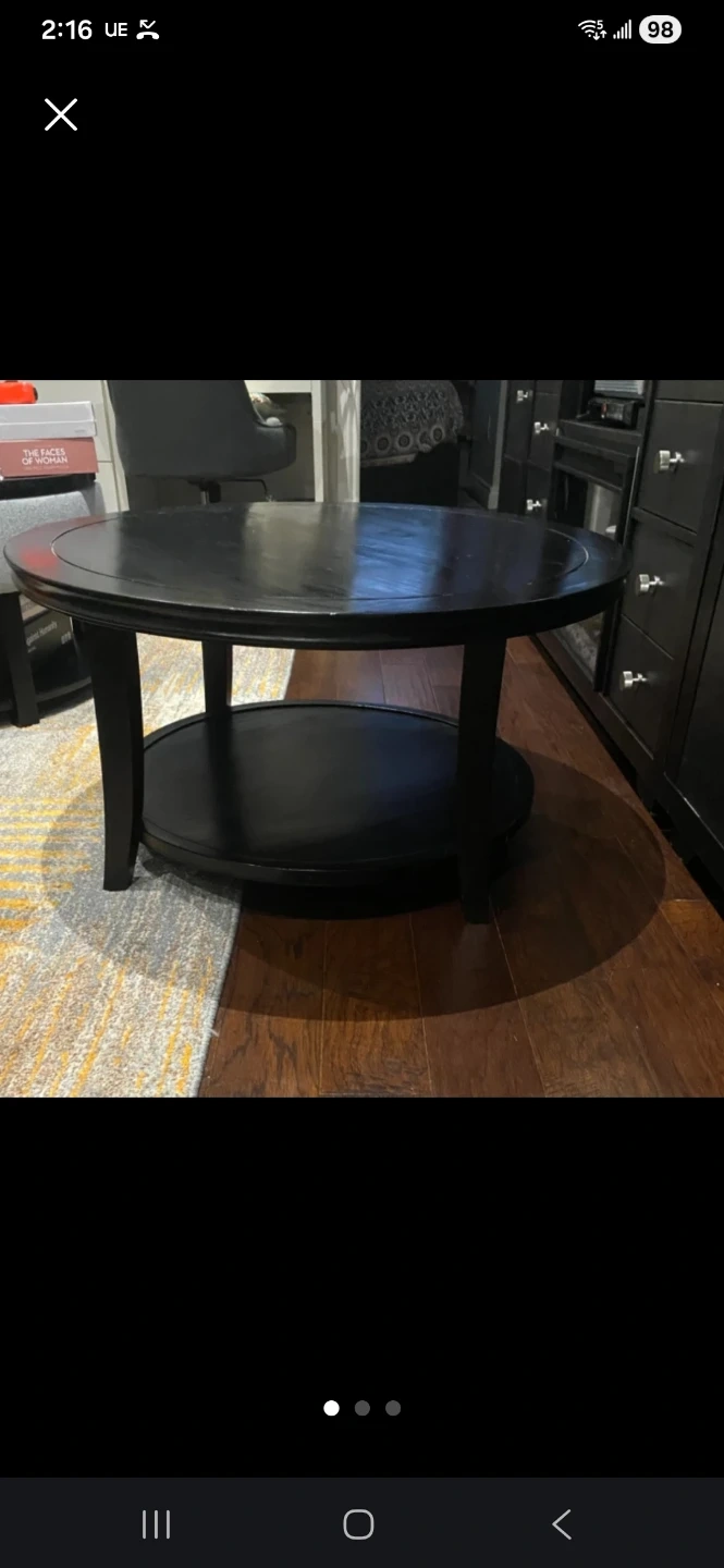 Selling a round wood coffee table in black-brown. It has a classic design with a lower shelf for extra storage or decor. Perfect for any living room! Measures 37β in diameter and 17-3/4β in height.