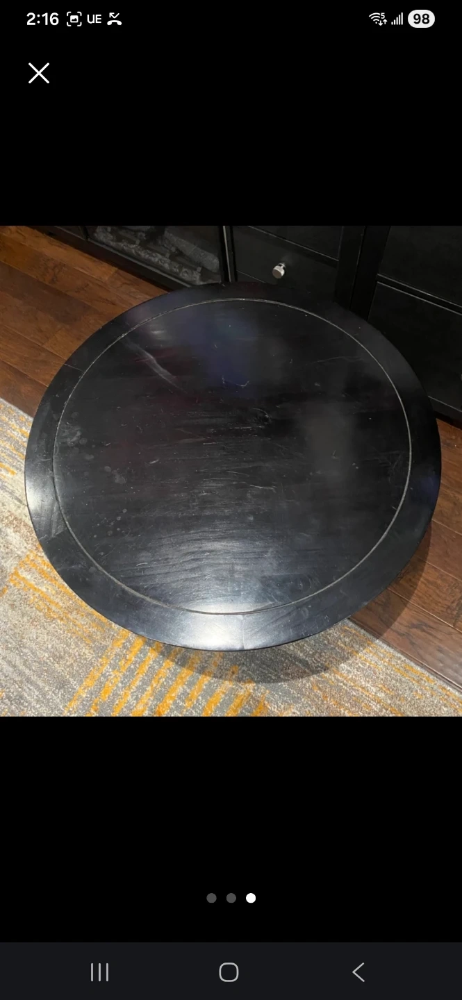 Selling a round wood coffee table in black-brown. It has a classic design with a lower shelf for extra storage or decor. Perfect for any living room! Measures 37β in diameter and 17-3/4β in height.
