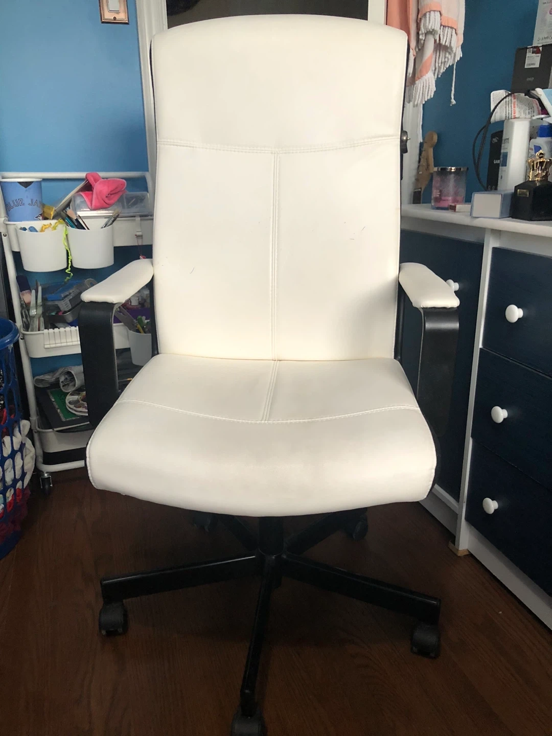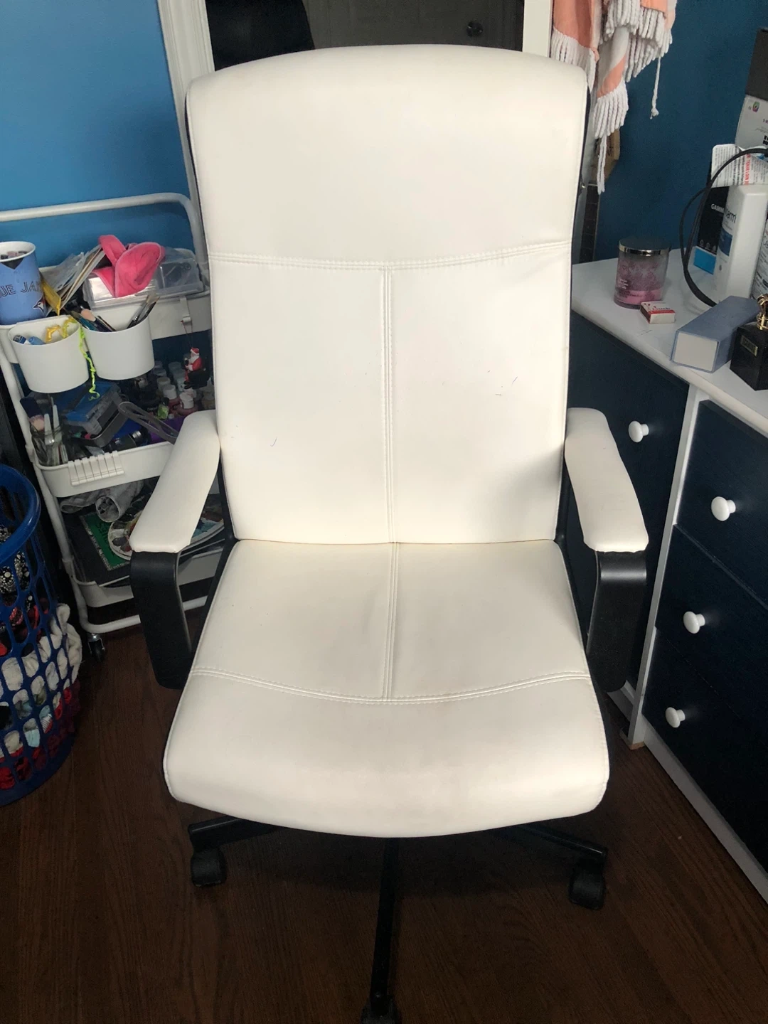 This is a white office chair with black accents. It has adjustable height and a swivel base with wheels. The seat and back are padded for comfort. It's great for any home office or workspace!