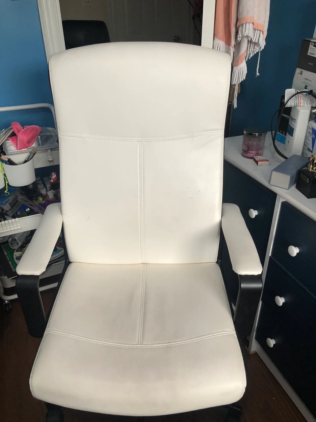 This is a white office chair with black accents. It has adjustable height and a swivel base with wheels. The seat and back are padded for comfort. It's great for any home office or workspace!