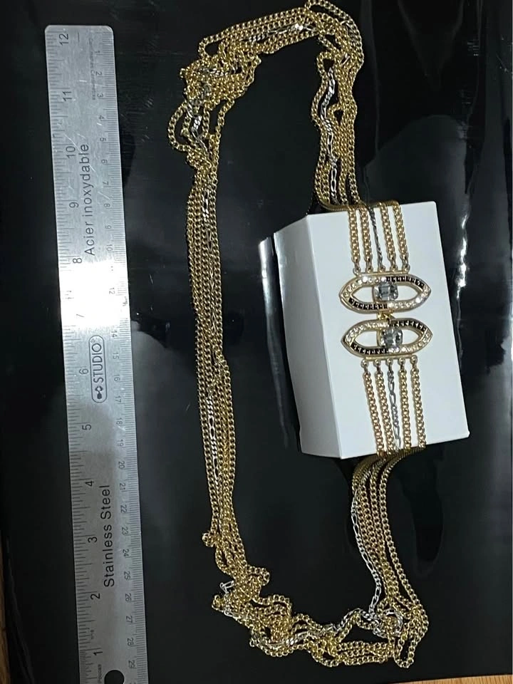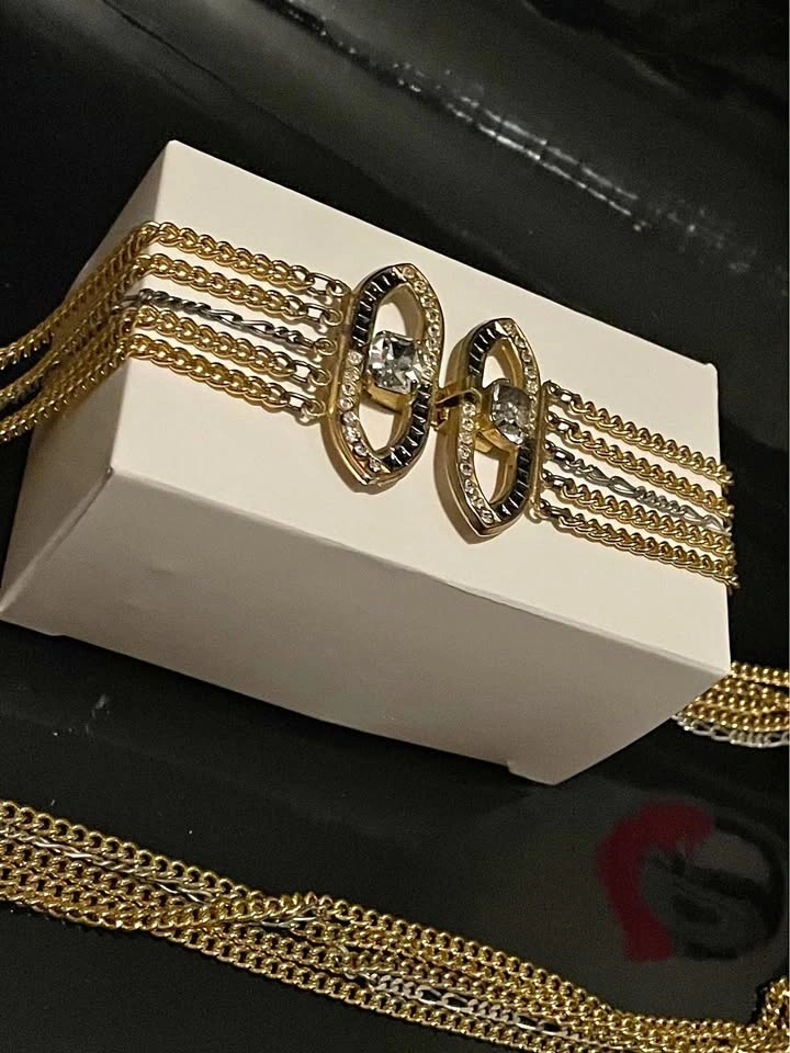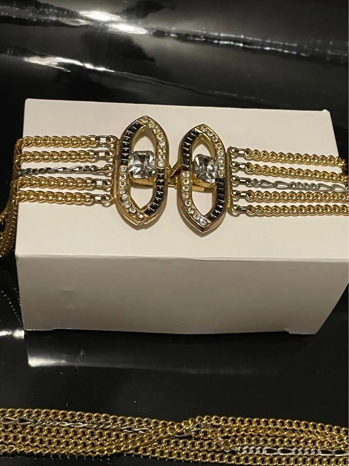 Vintage elegant multi strand necklace with five rows of long gold and silver toned chains. The centerpiece features two oval shaped gold tone ornaments set with small clear crystals and a larger square cut crystal in the middle. The metal is polished and shiny with a secure clasp mechanism. This would make a lovely Mother's Day gift.