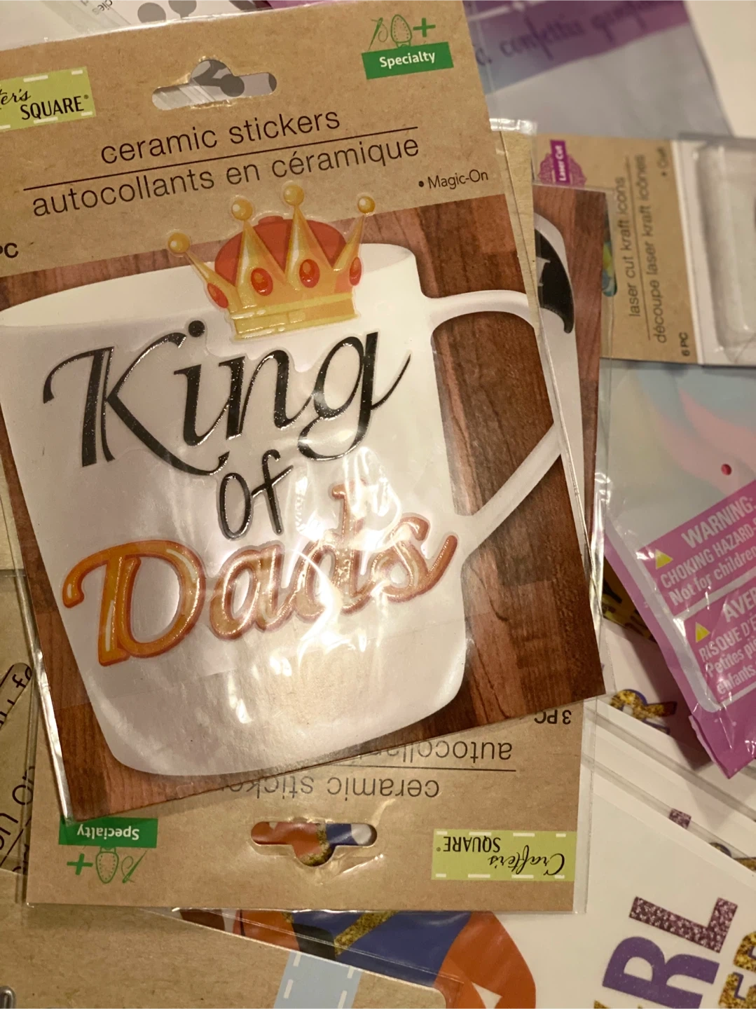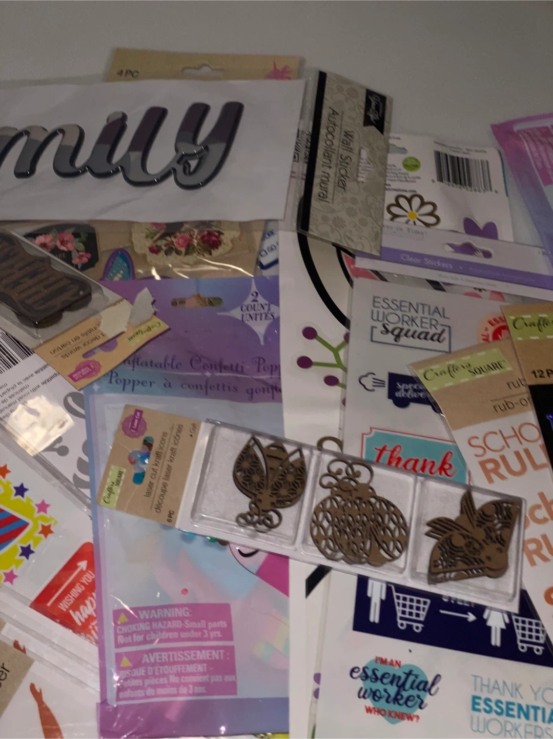 A collection of various craft stickers and embellishments including ceramic stickers, metallic flower stickers, and themed stickers for birthdays and essential workers. These items are great for scrapbooking, card making, or other DIY projects!