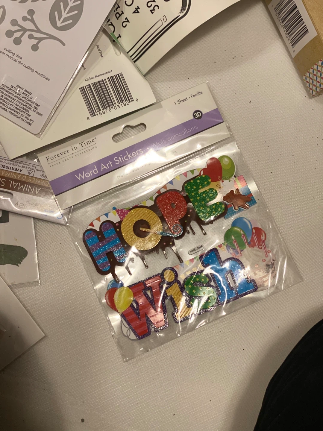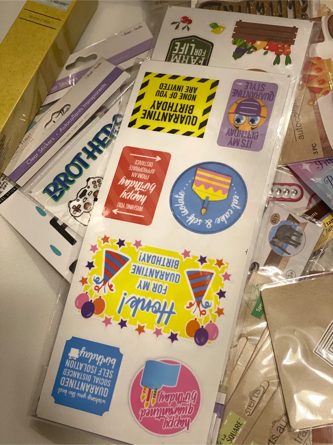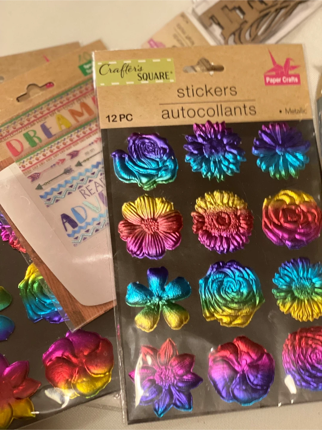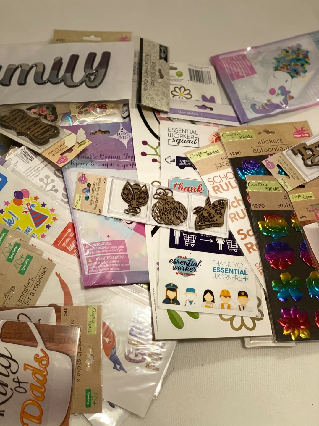A collection of various craft stickers and embellishments including ceramic stickers, metallic flower stickers, and themed stickers for birthdays and essential workers. These items are great for scrapbooking, card making, or other DIY projects!