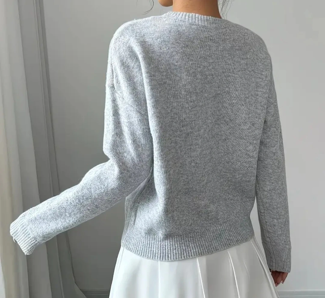 Cozy grey sweater featuring a delicate floral appliqué design on the front. It's a soft knit with a classic crew neck and long sleeves. Perfect for adding a touch of charm to your everyday outfits!