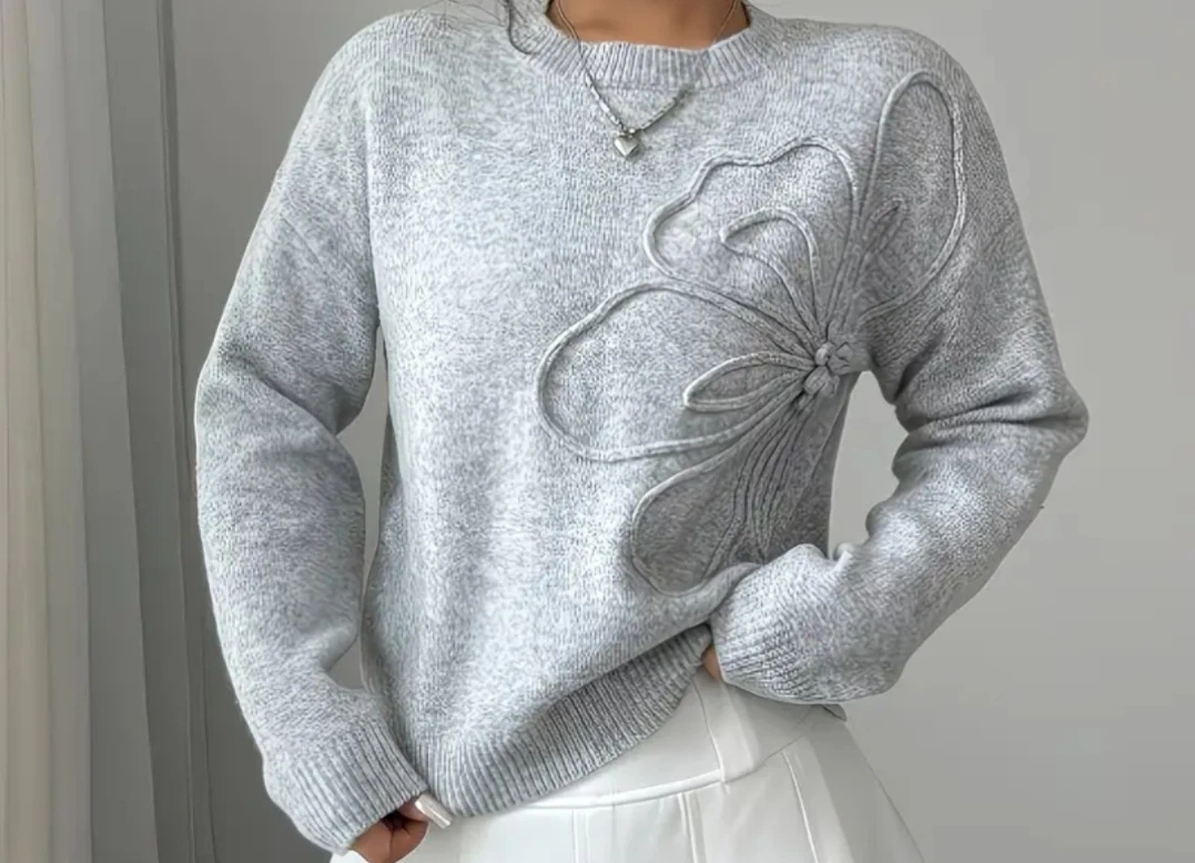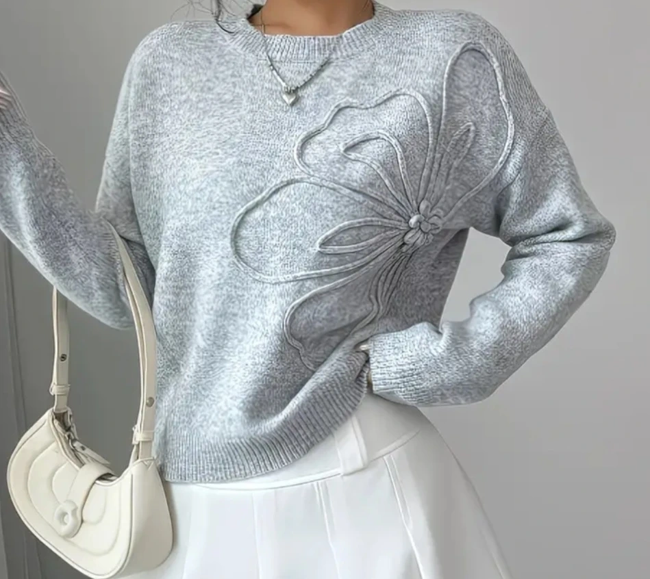 Cozy grey sweater featuring a delicate floral appliqué design on the front. It's a soft knit with a classic crew neck and long sleeves. Perfect for adding a touch of charm to your everyday outfits!