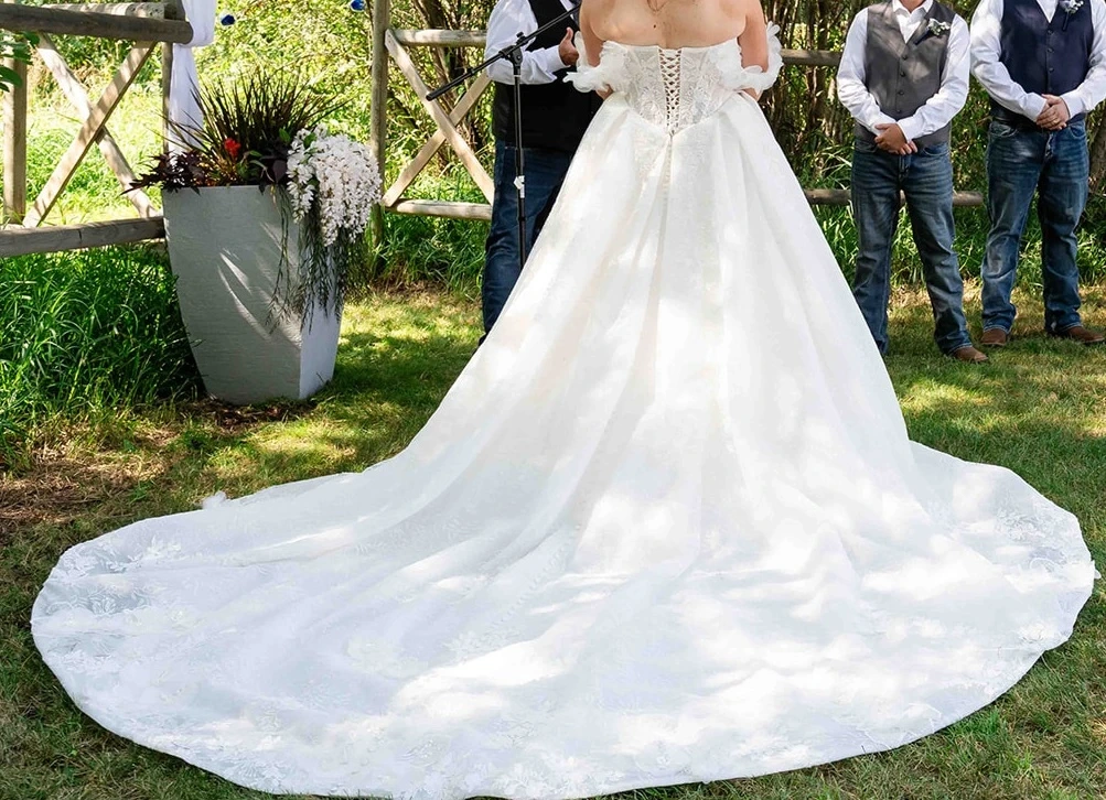 Beautiful white ball gown wedding dress with intricate lace detailing and a corset back. It features a full skirt and off-the-shoulder sleeves.