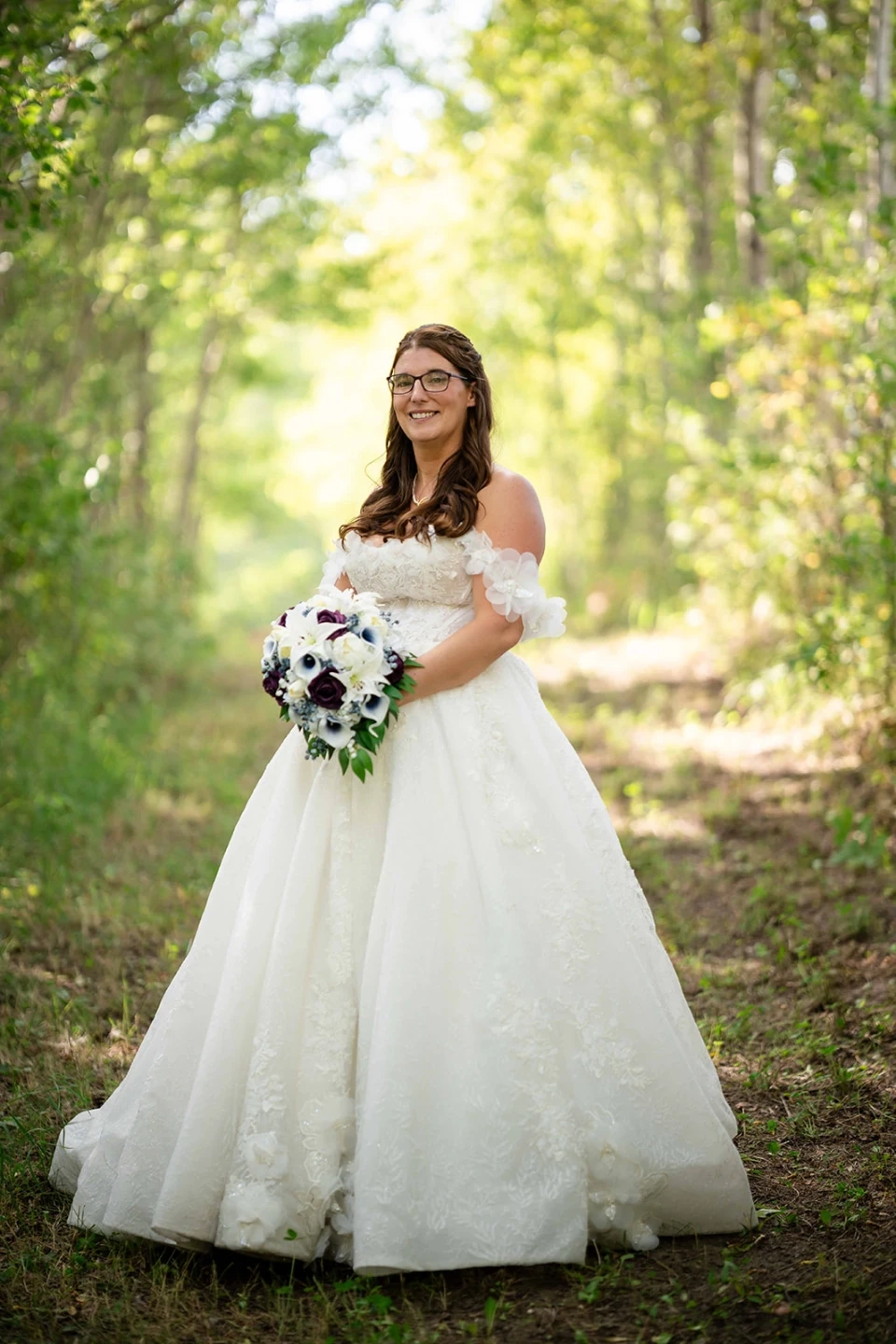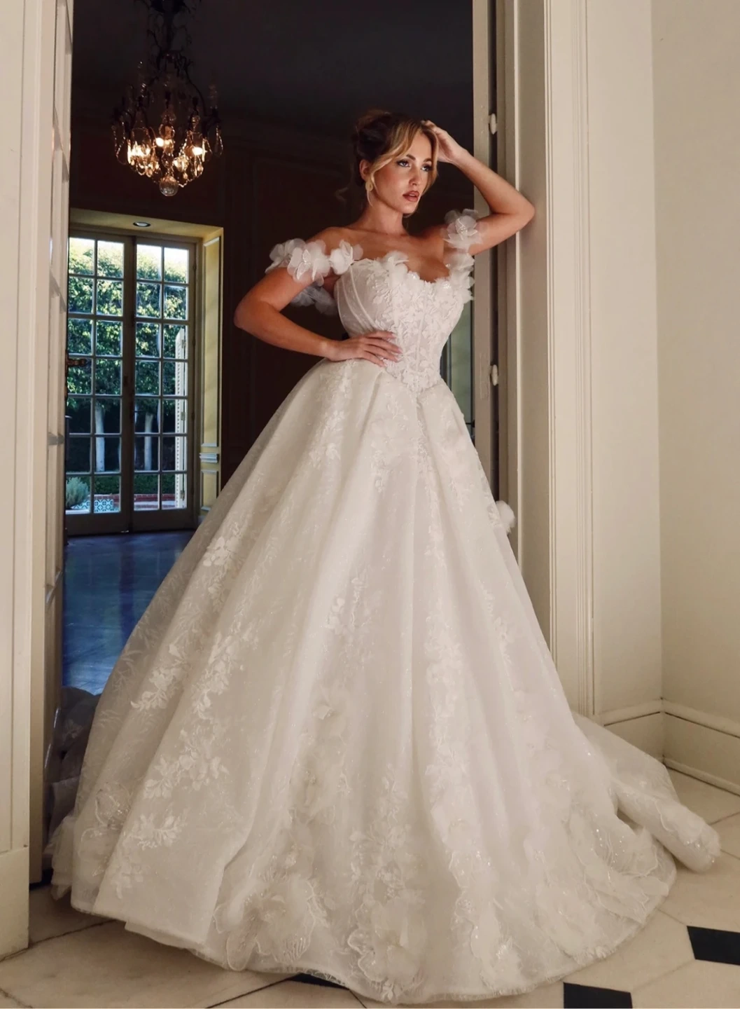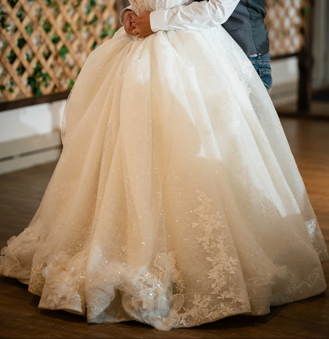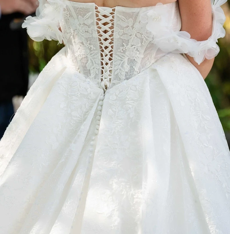 Beautiful white ball gown wedding dress with intricate lace detailing and a corset back. It features a full skirt and off-the-shoulder sleeves.