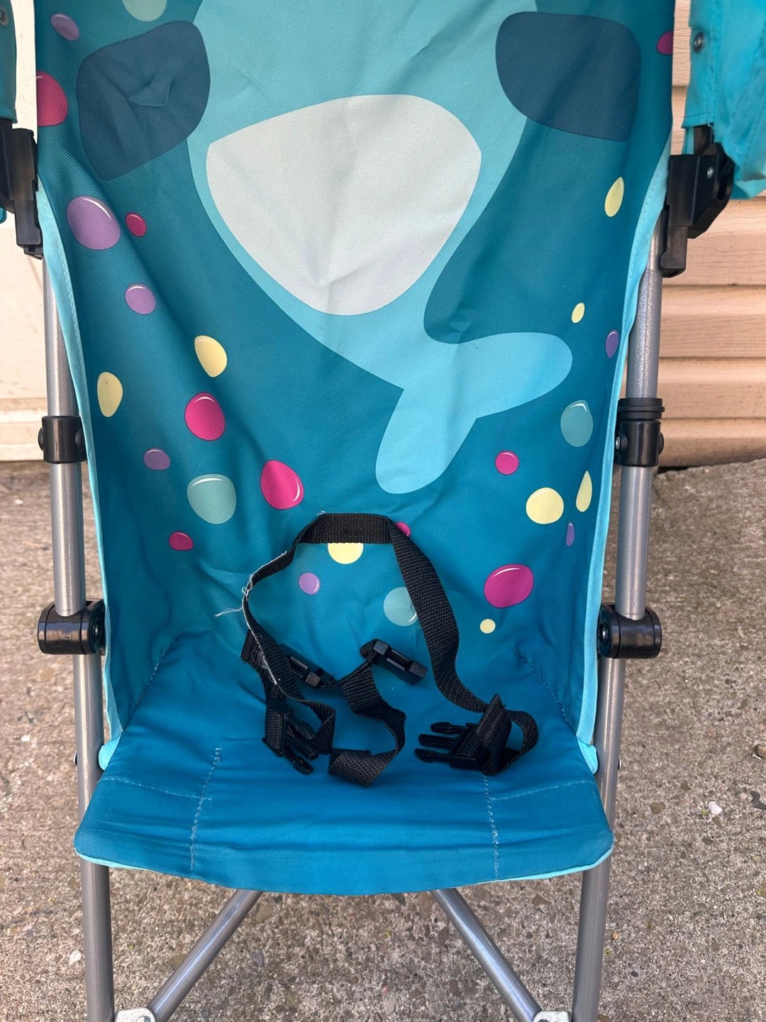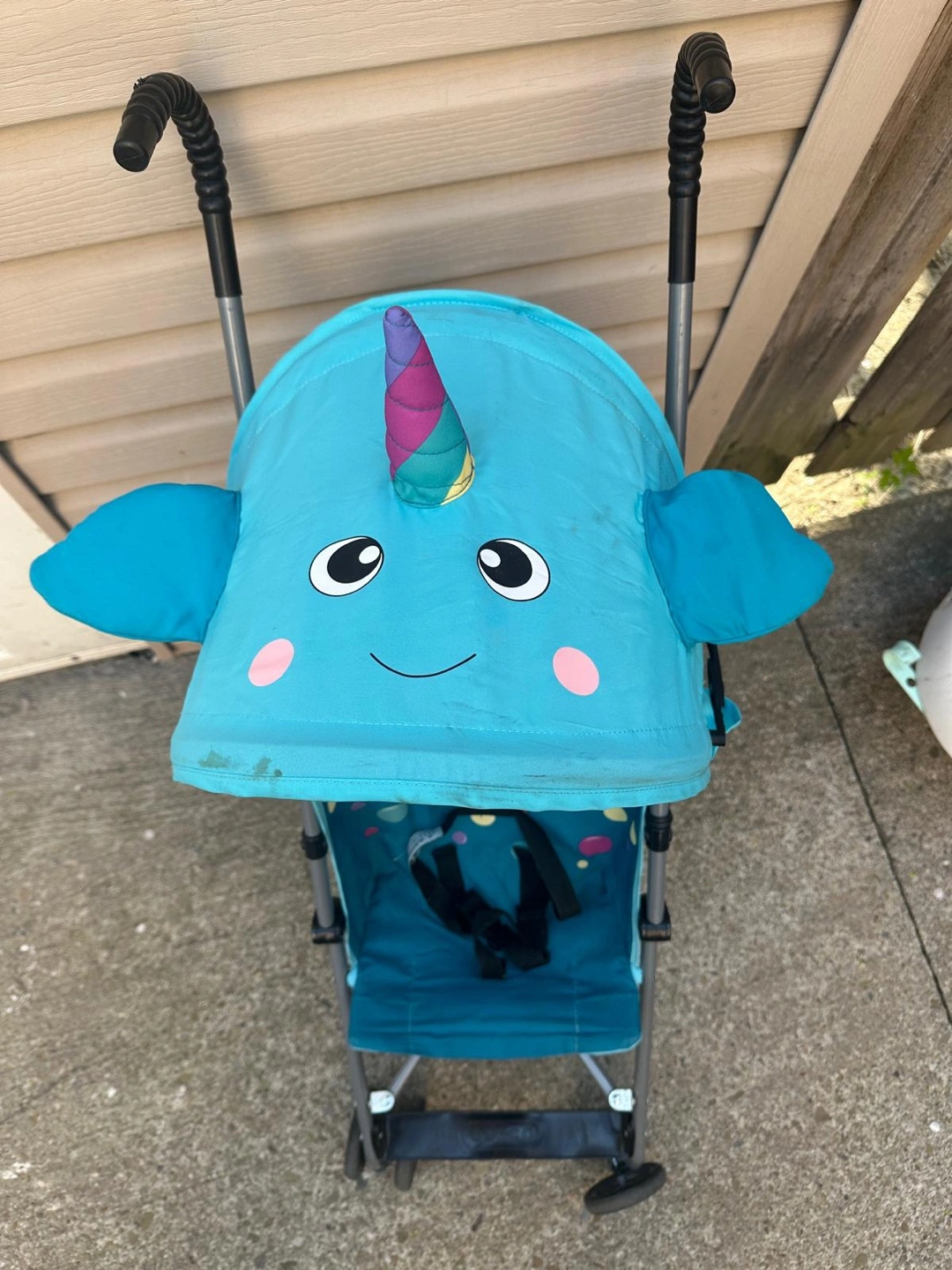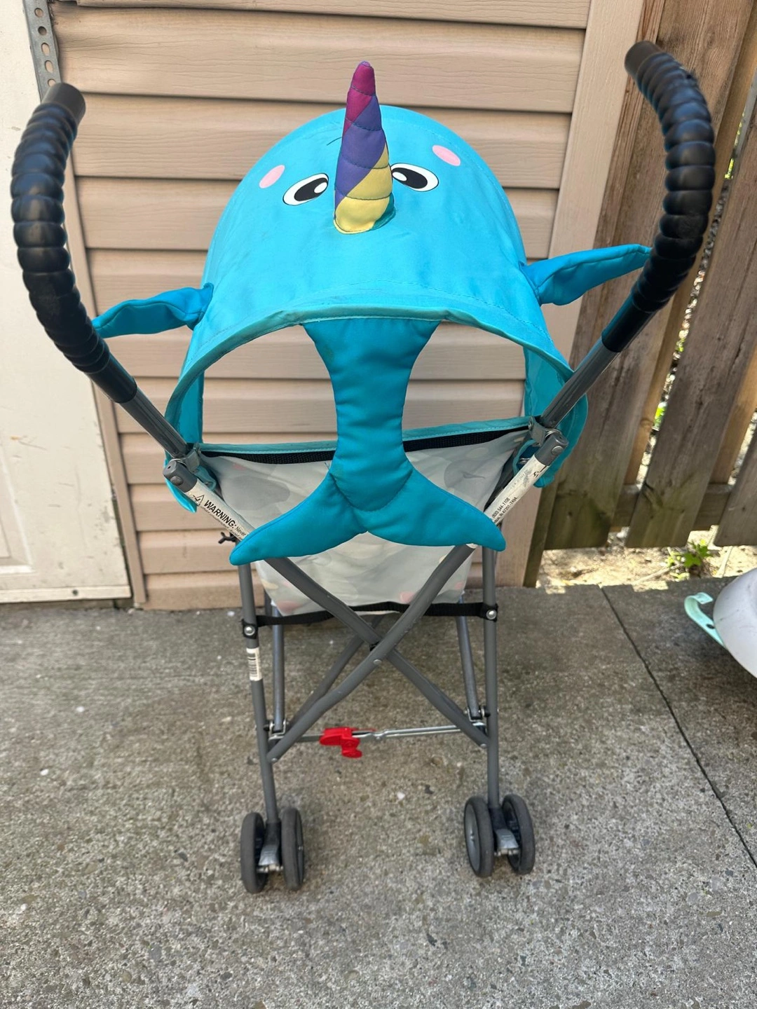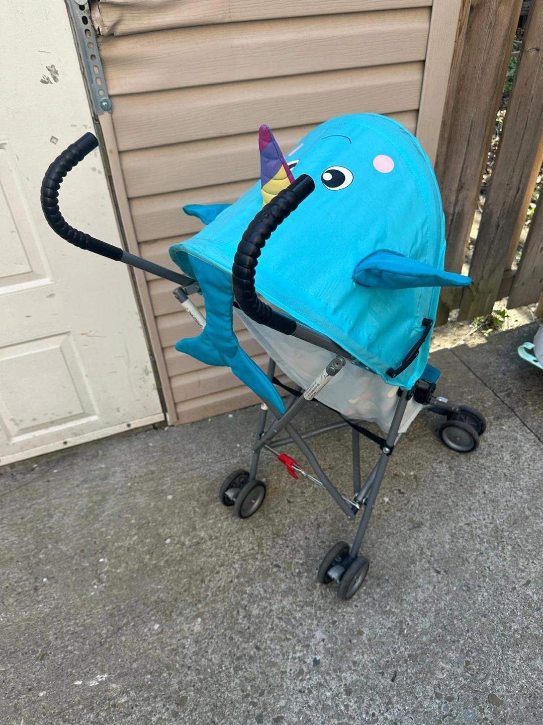 Lightweight stroller. Features a narwhal design canopy. Folds compactly. Includes safety harness.