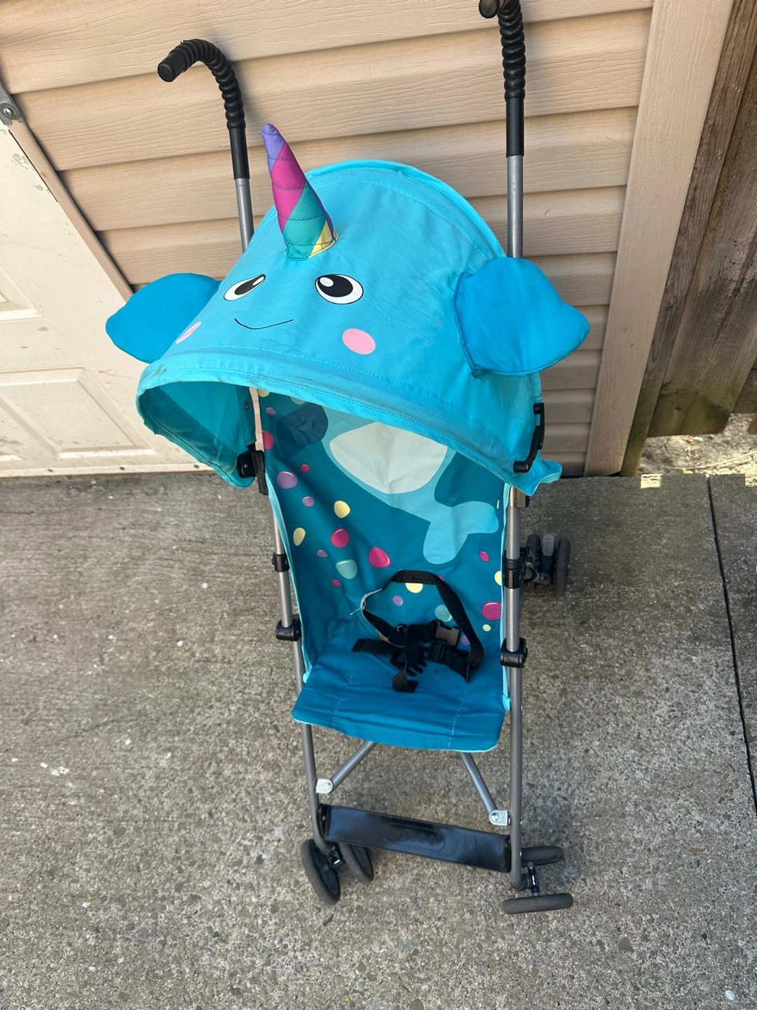 Lightweight stroller. Features a narwhal design canopy. Folds compactly. Includes safety harness.