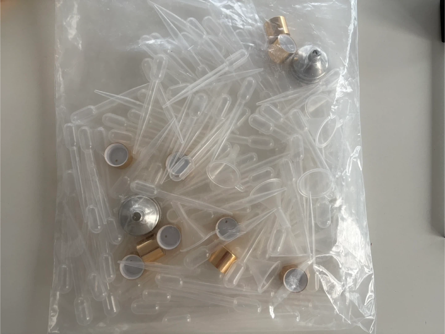 A large quantity of plastic pipette droppers and a few small metal and plastic funnels and metal screw-on caps for essential oils or small liquid transfers. These are great for DIY perfume or cosmetic crafting. All are new and unused.