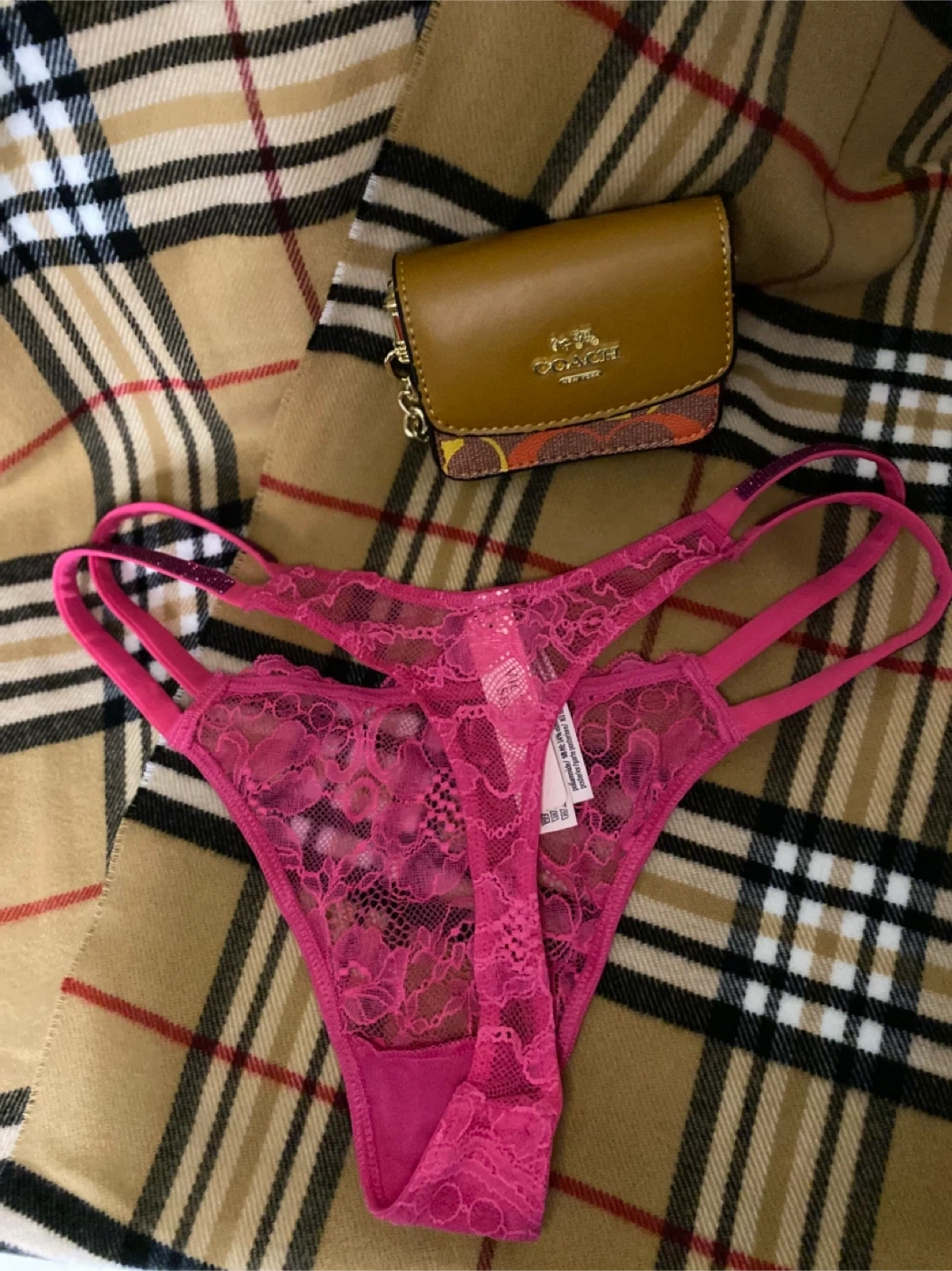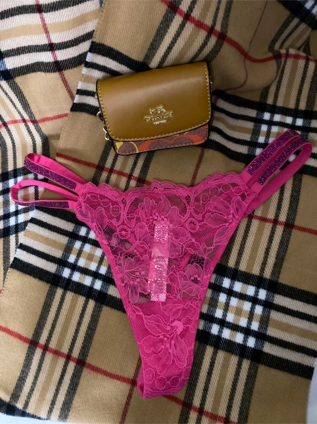 Bright pink lace thong panty from Victoria's Secret. Features sparkly pink straps. Size is Small.