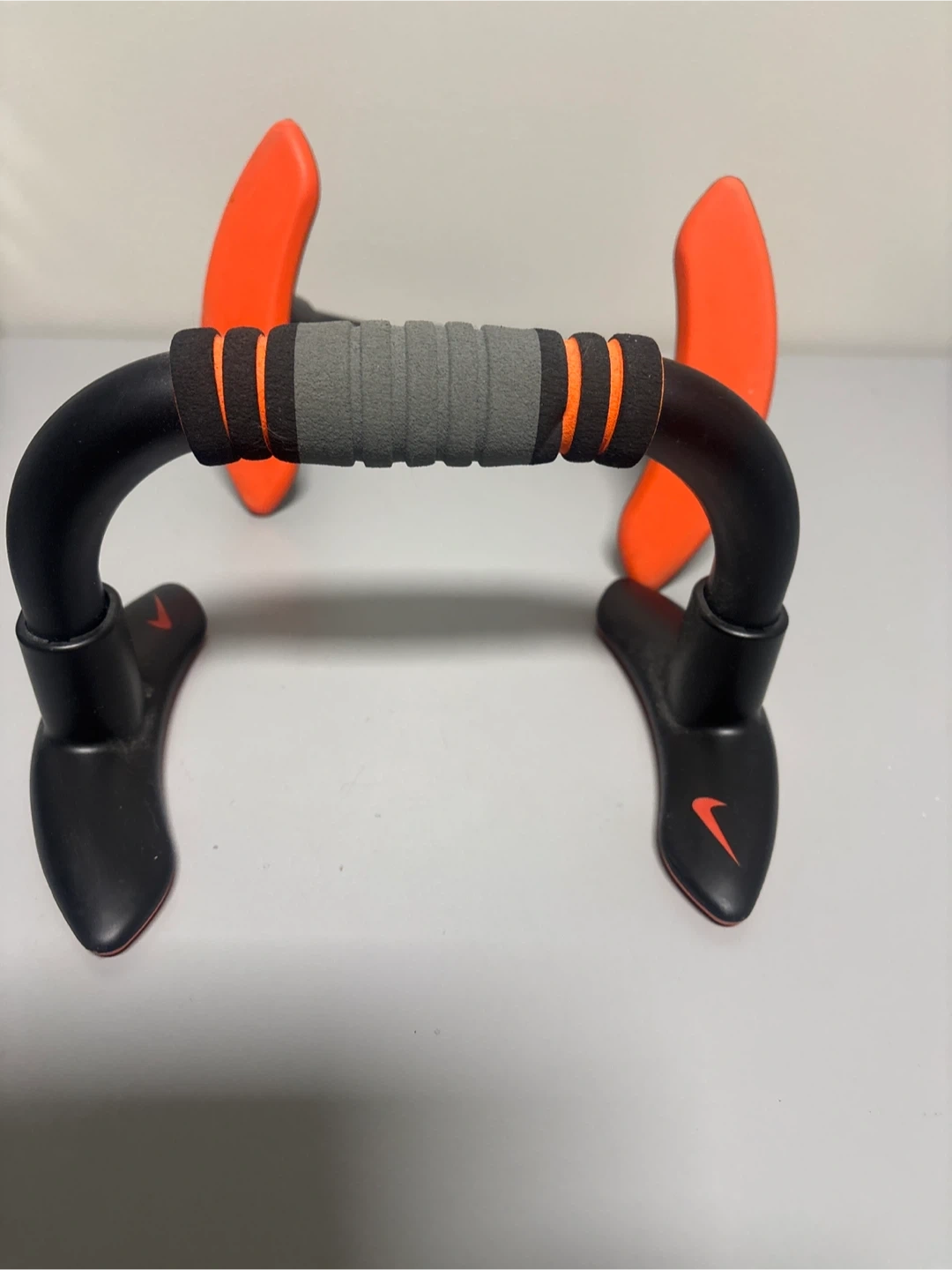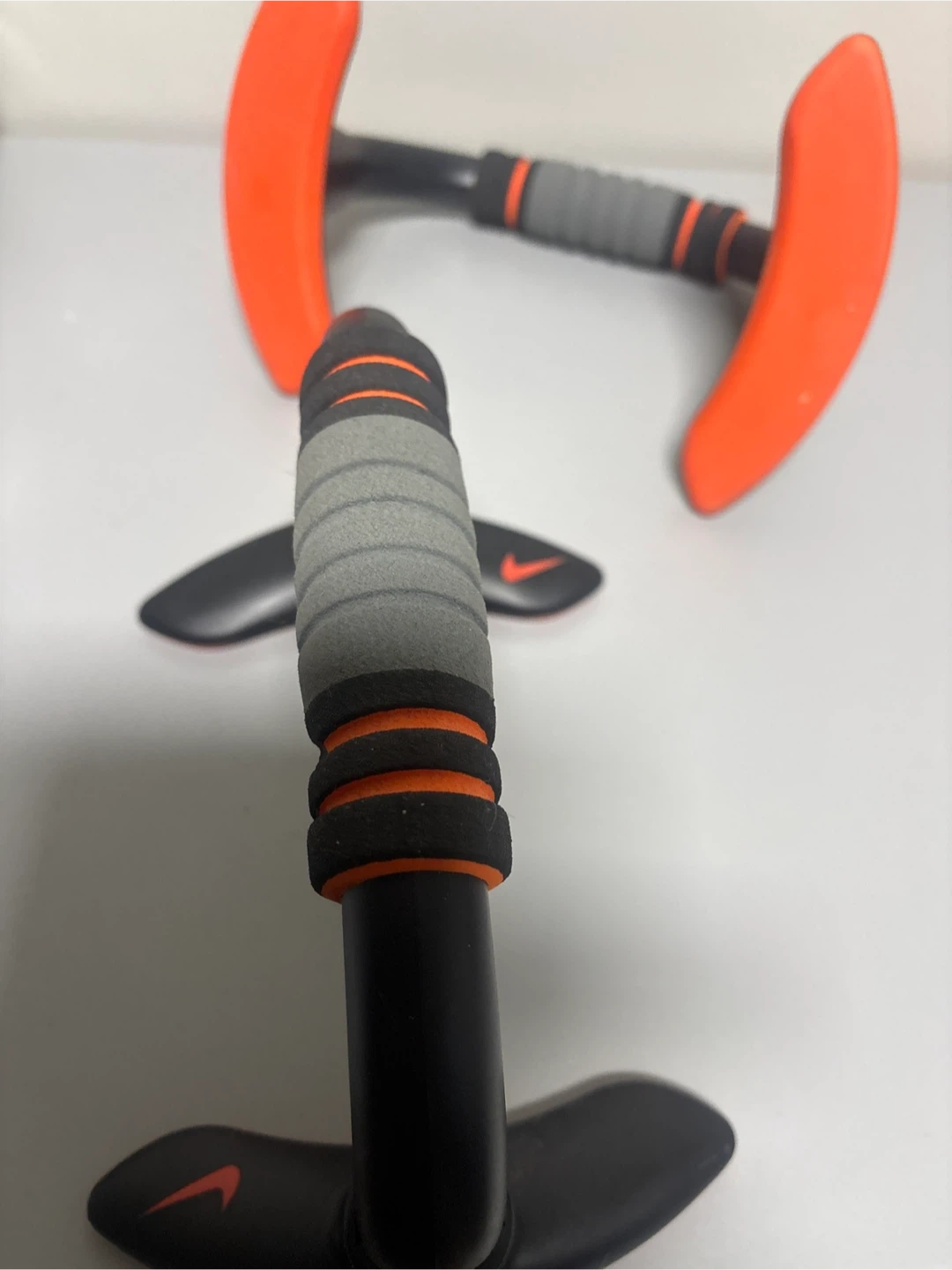 These Nike push up bars feature comfortable padded grips and a stable base. They're black with orange accents and the iconic Nike swoosh logo. Perfect for enhancing your workout routine!