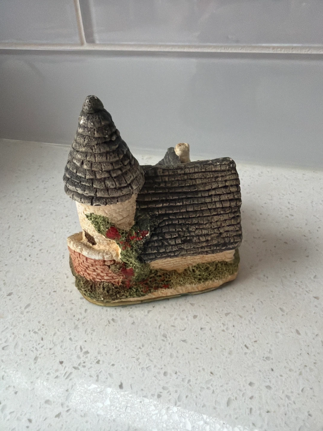 This is a miniature house figurine, perfect for collectors or dollhouses. It's intricately detailed with a stone tower and a shingled roof. A lovely decorative piece!