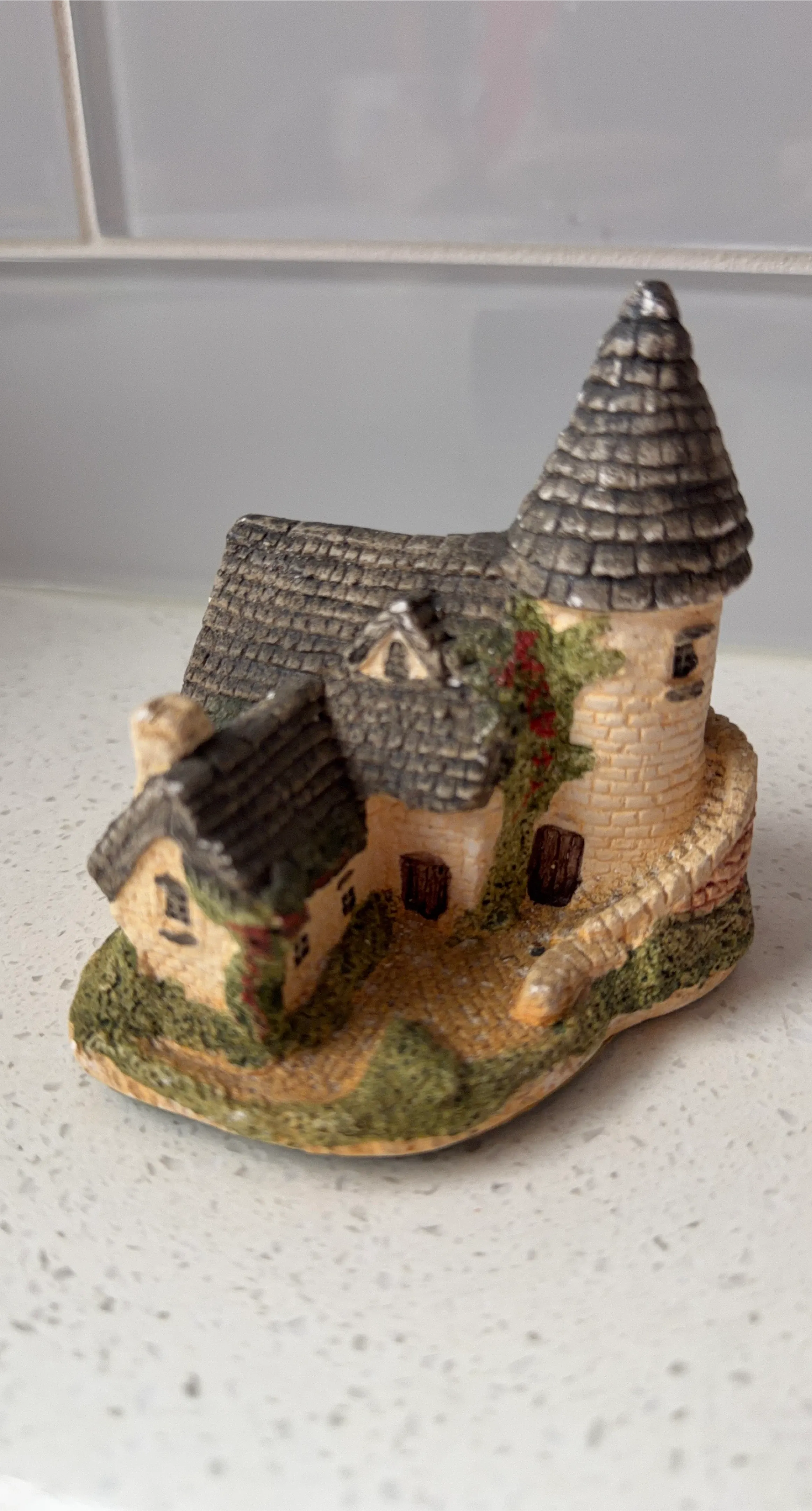 This is a miniature house figurine, perfect for collectors or dollhouses. It's intricately detailed with a stone tower and a shingled roof. A lovely decorative piece!