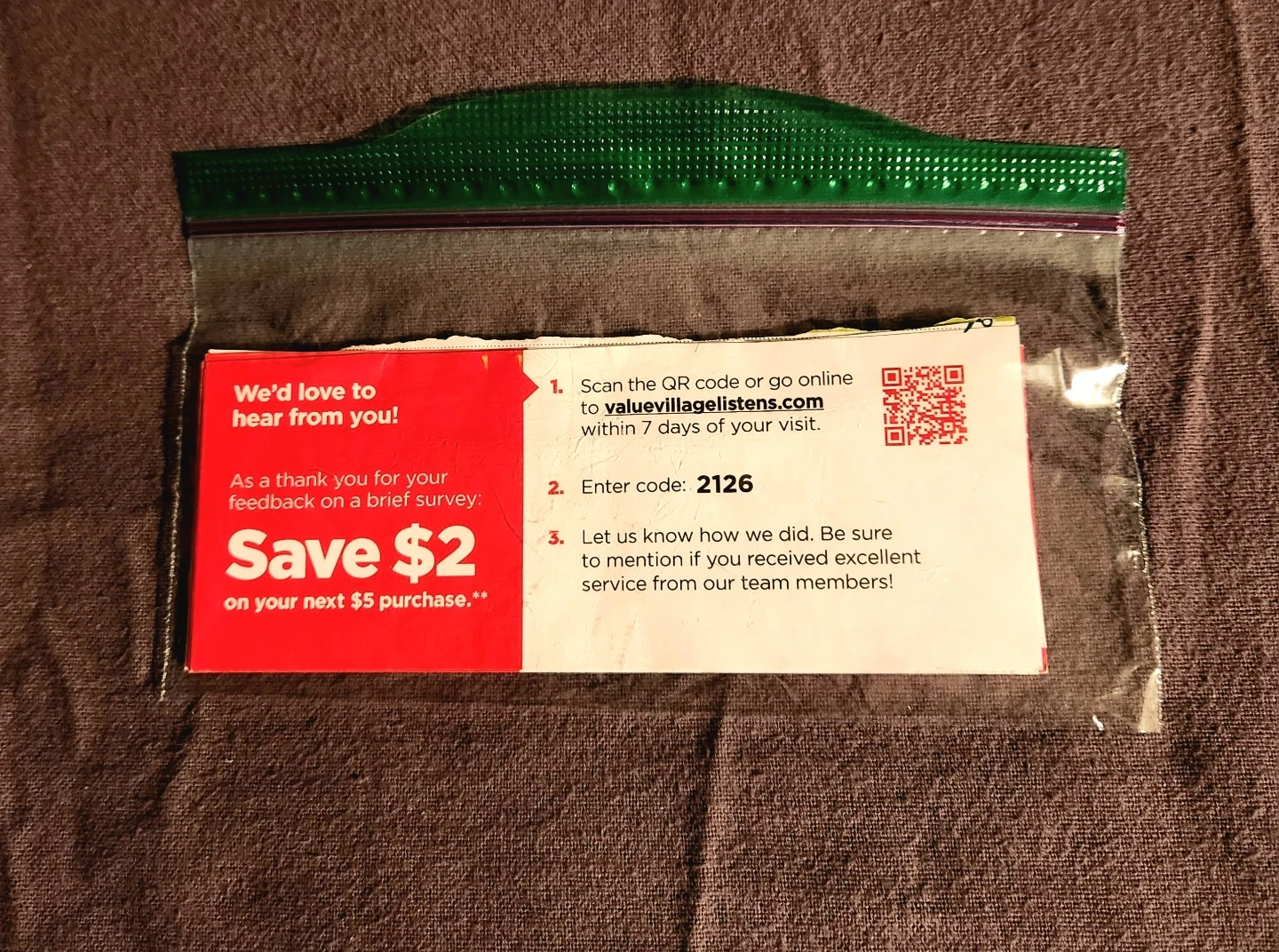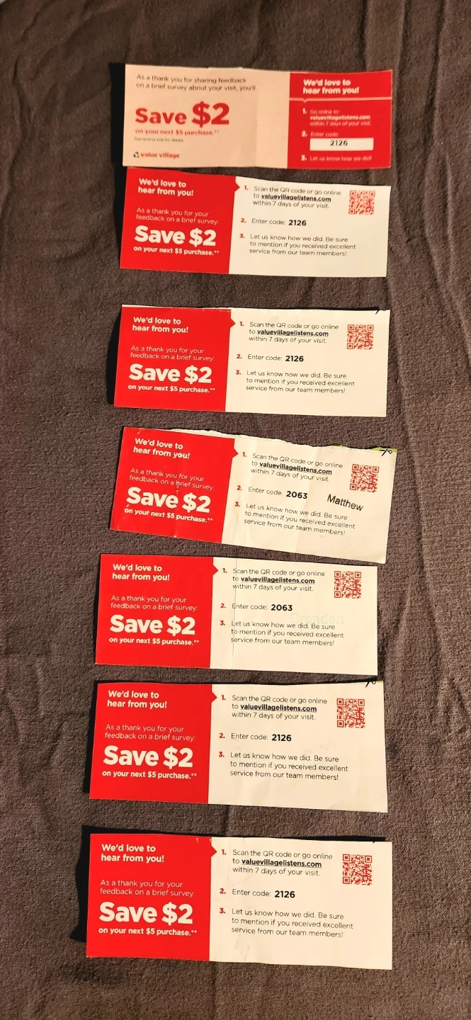 There's a website on the coupon. You go to the site, fill out the survey and it gives you a code. Write it on the coupon. At Value Village, hand the coupon to the cashier and she will take $2 off your minimum purchase if $5 before taxes.