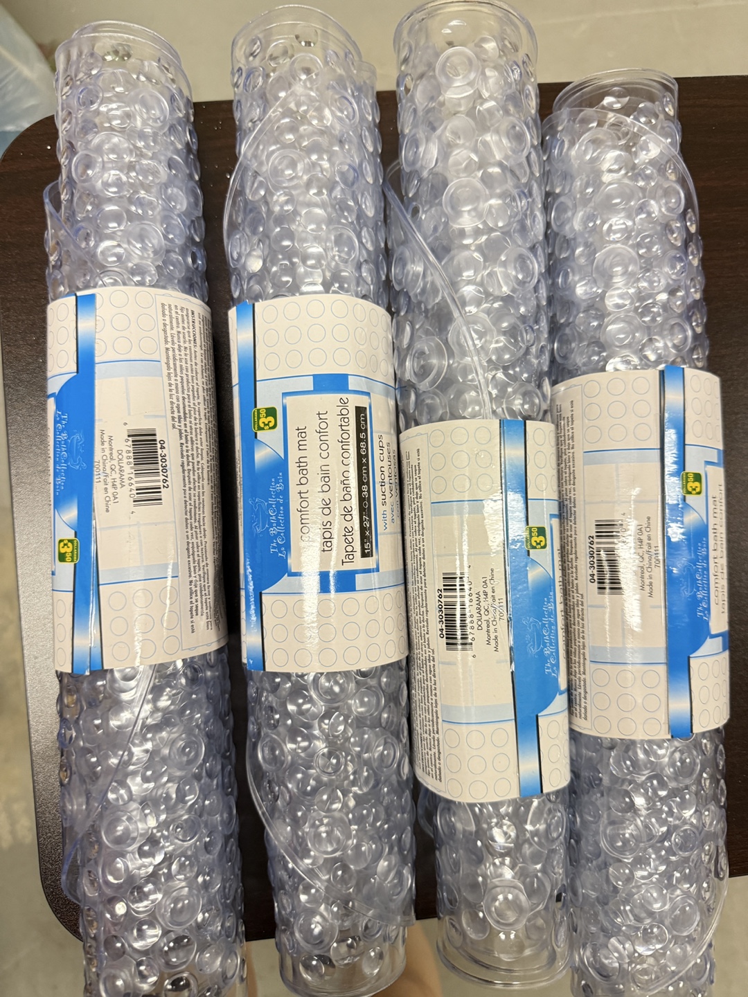 Selling four Dollarama comfort bath mats! They're clear and measure 15 x 27 inches (38 cm x 68.5 cm). They also have suction cups to keep them in place