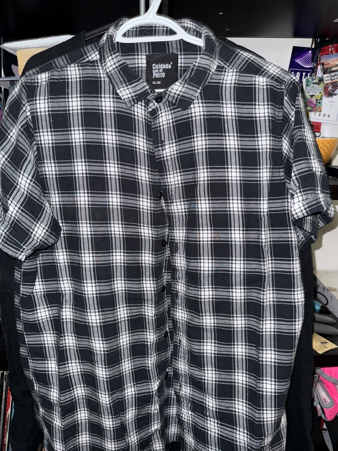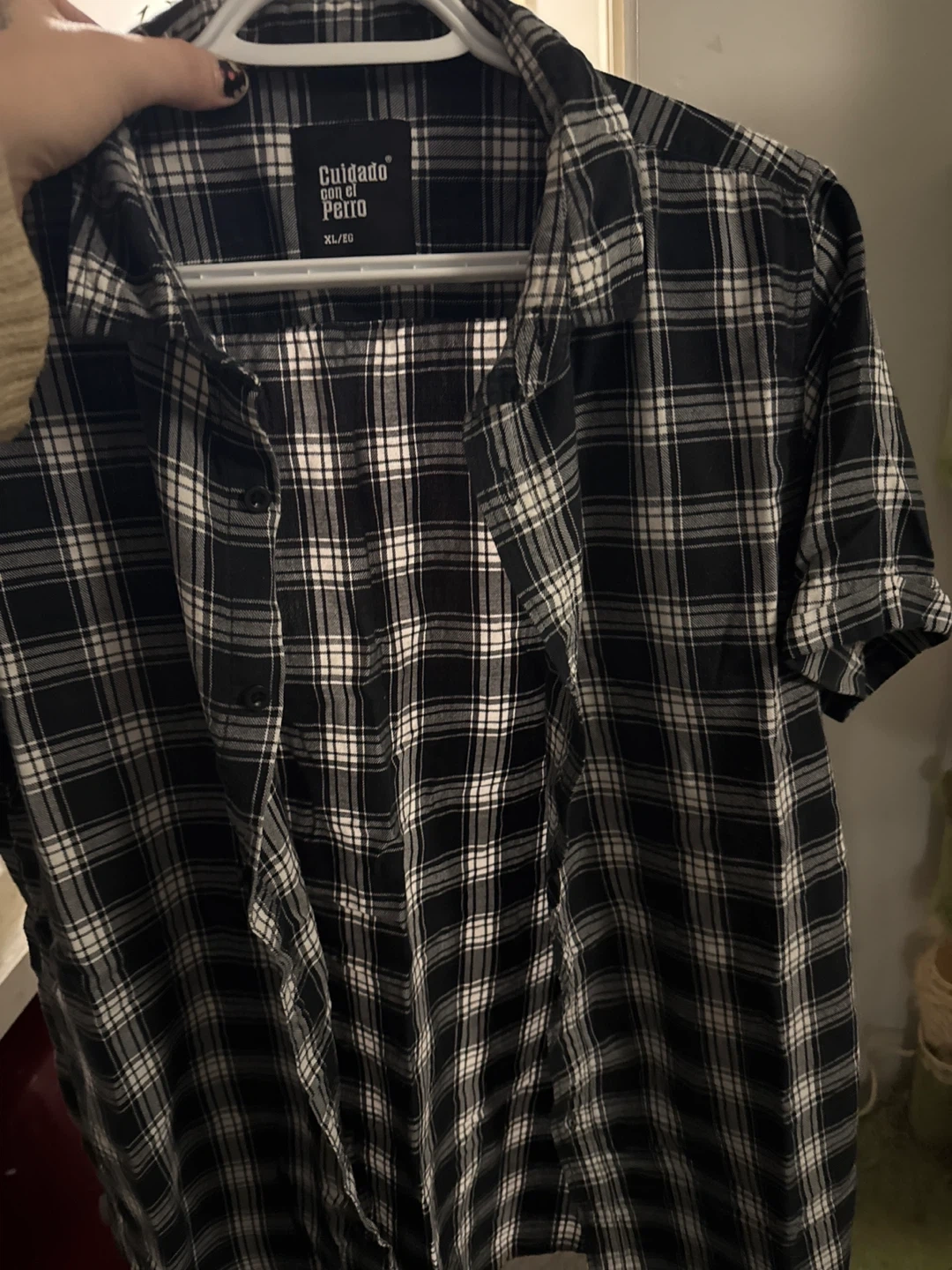 Cuidado Con El Perro short sleeve button-up shirt. Black and white plaid pattern.