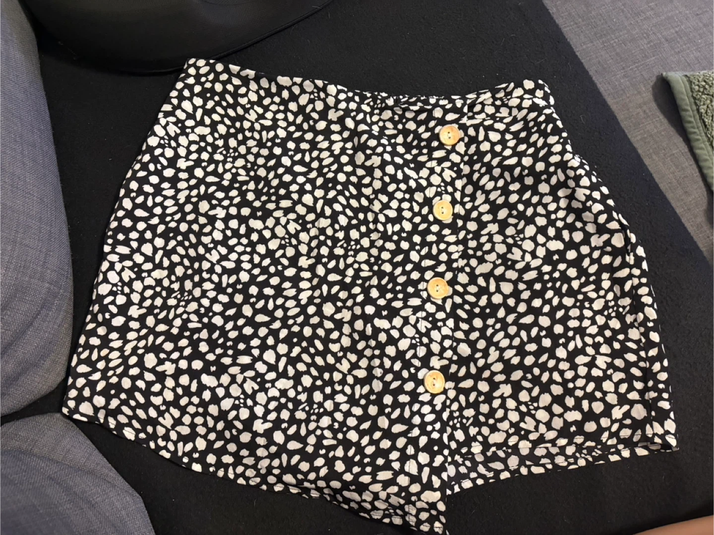 Cute dalmatian print skirt, perfect for summer! It's a size Medium and in great condition. The skirt features a comfortable elastic waistband and a button detail on the side. It's made of a lightweight material, so it's great for staying cool on warm days