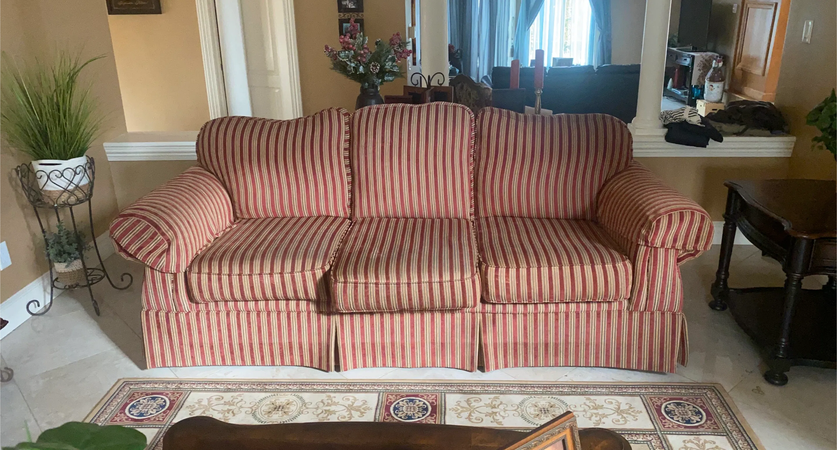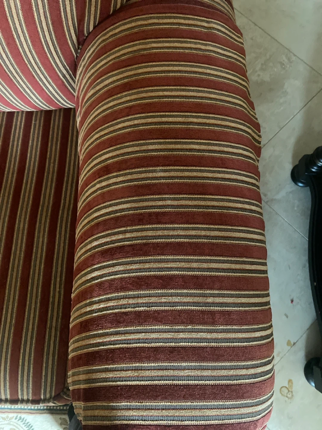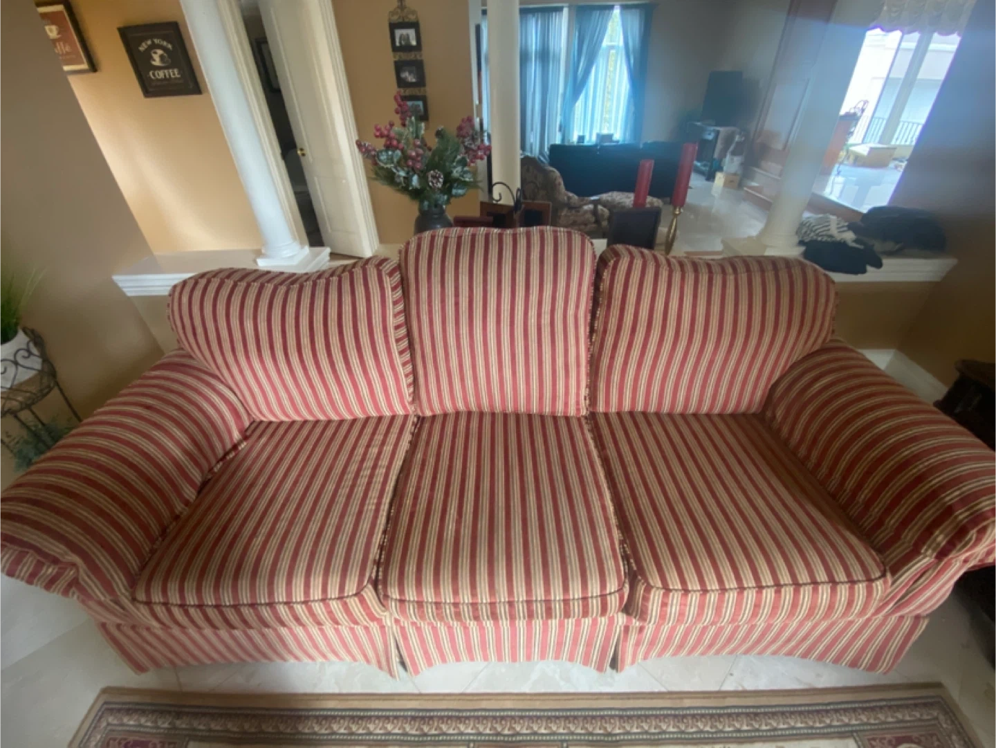 This is a comfortable three-seater sofa with a red, beige, and brown striped fabric. It has plush cushions and a skirted base. This sofa is great for a living room or family room.