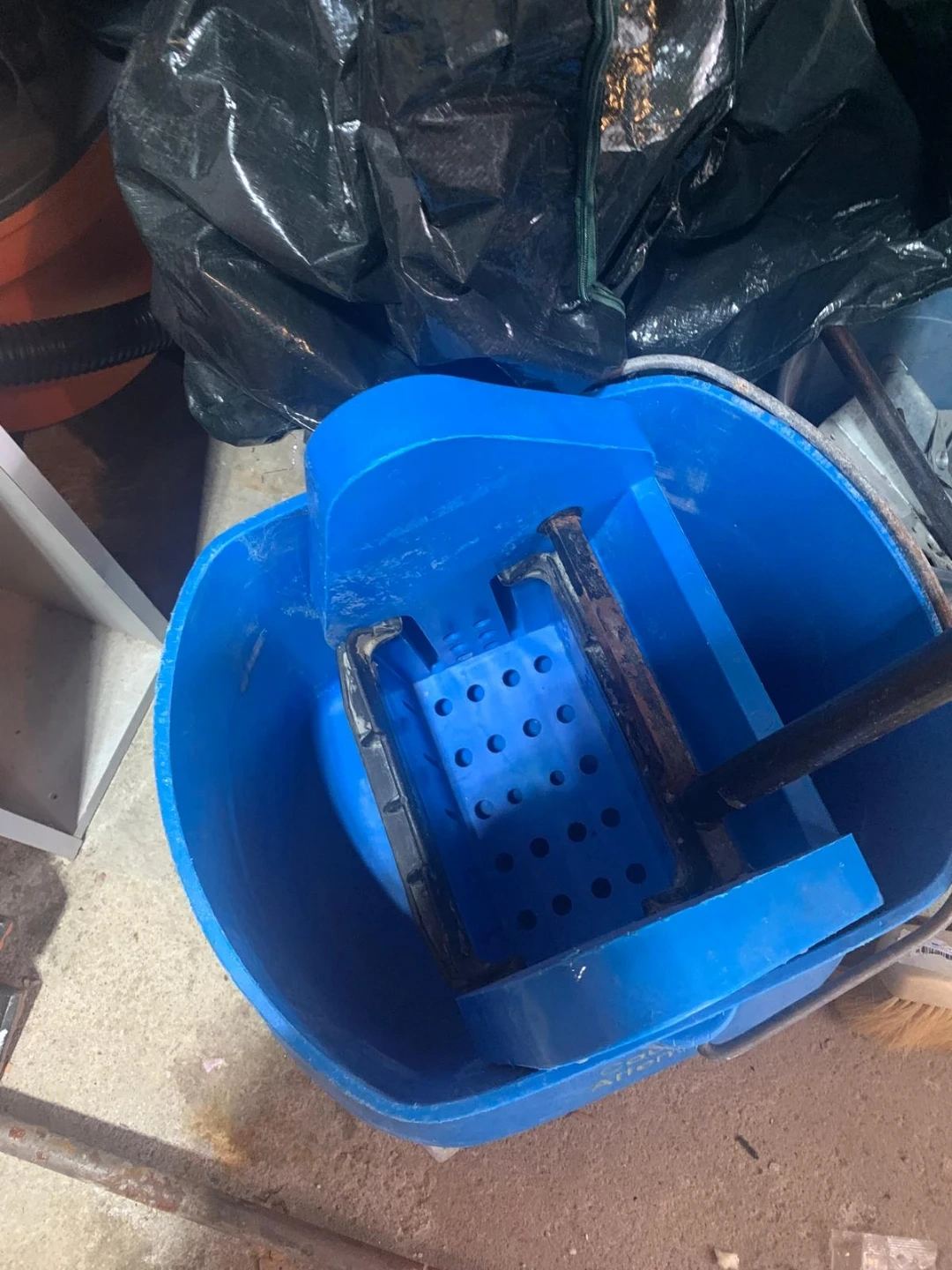 This is a blue mop bucket that includes a wringer attachment. It's made of durable plastic and has wheels for easy transport. Ideal for cleaning larger floor areas efficiently. The wringer helps to remove excess water from the mop.