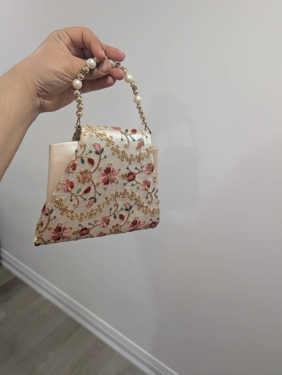 This beautiful clutch bag features intricate floral embroidery with bead and rhinestone accents. It has a secure clasp closure and a decorative pearl and bead handle. It's perfect for special occasions or evening wear!