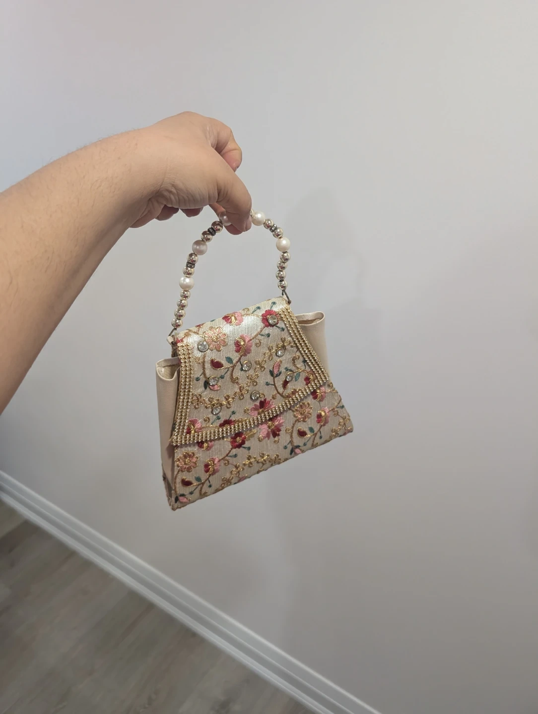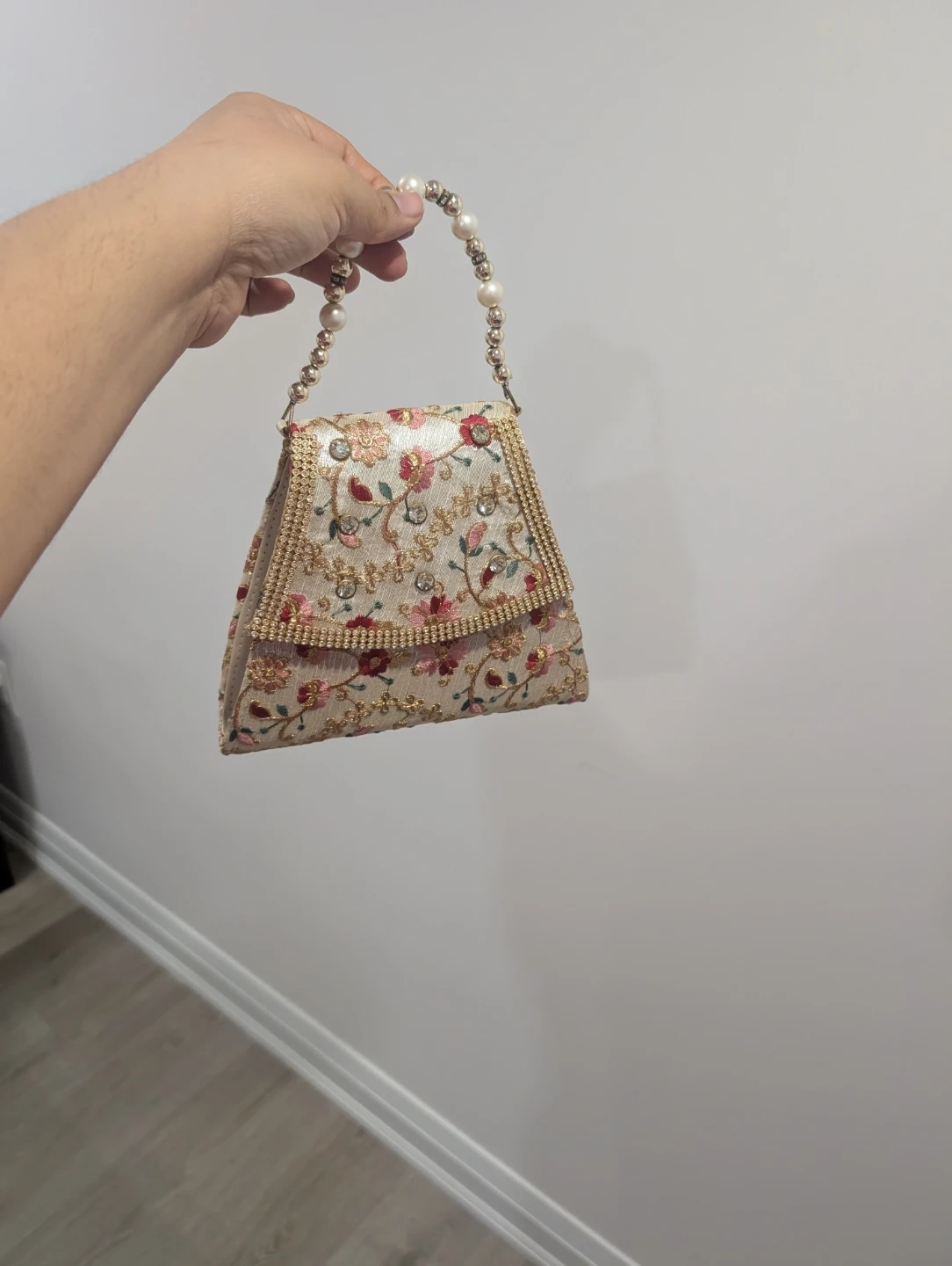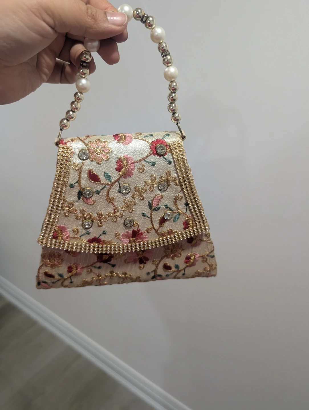 This beautiful clutch bag features intricate floral embroidery with bead and rhinestone accents. It has a secure clasp closure and a decorative pearl and bead handle. It's perfect for special occasions or evening wear!