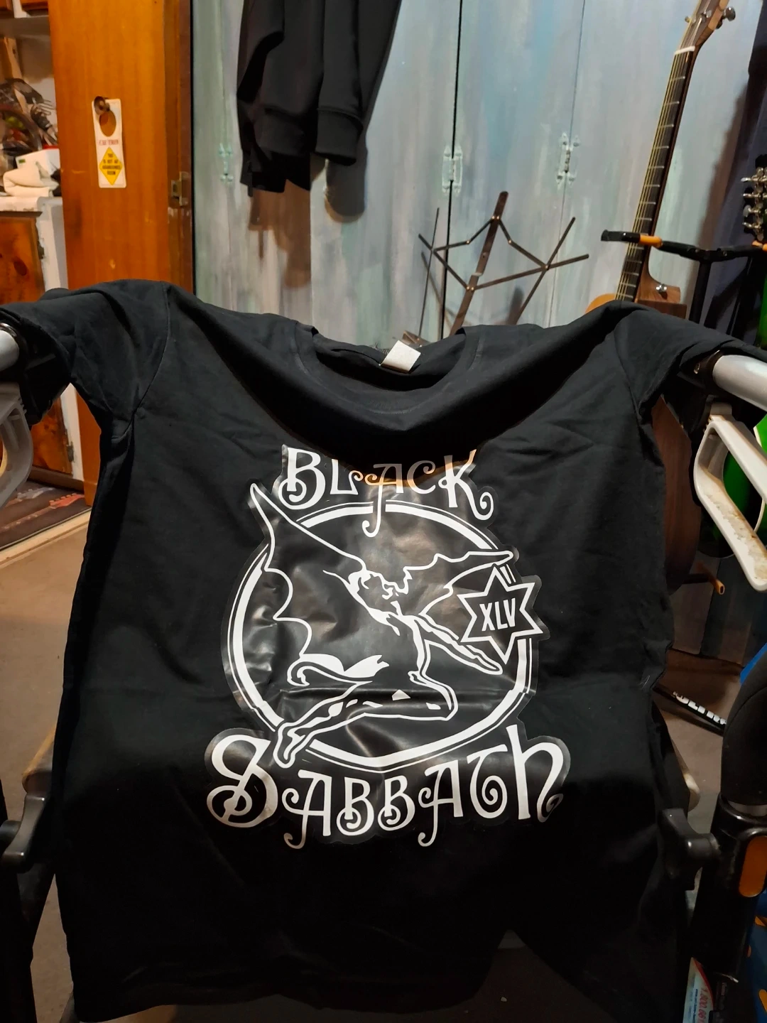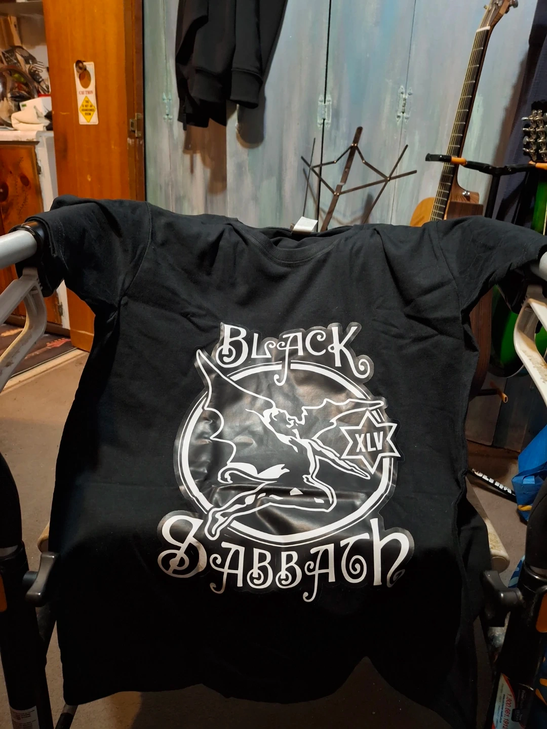 Black short-sleeved t-shirt featuring the iconic Black Sabbath logo and imagery. It's made of comfortable cotton material. A must-have for any fan of the legendary band!