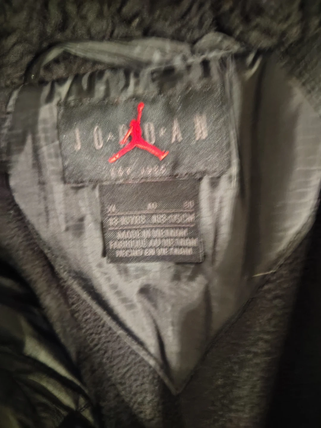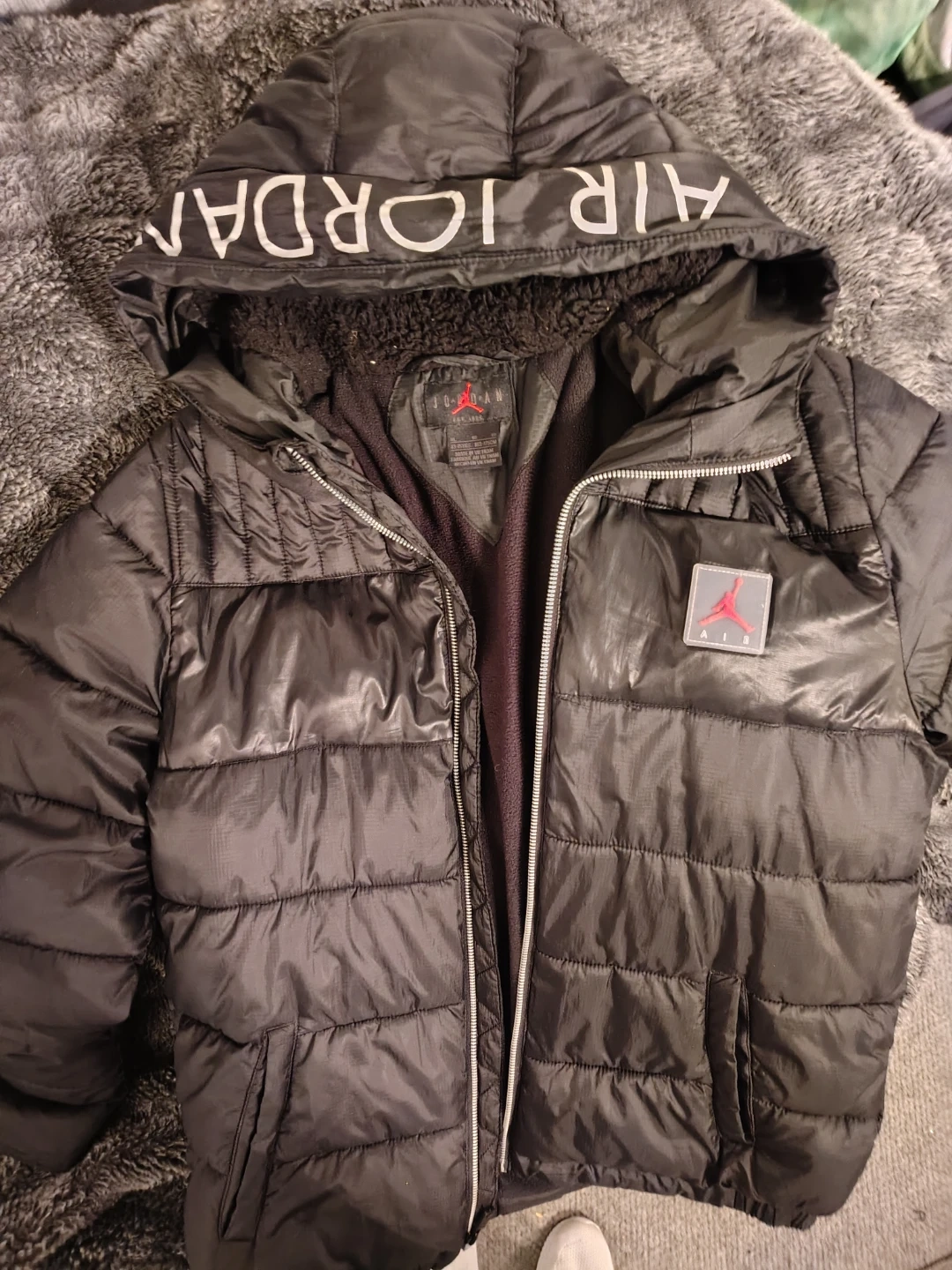 Black Jordan puffer jacket with fleece lining. Features "AIR JORDAN" detailing on the hood. Size XL for kids. Made in Vietnam.