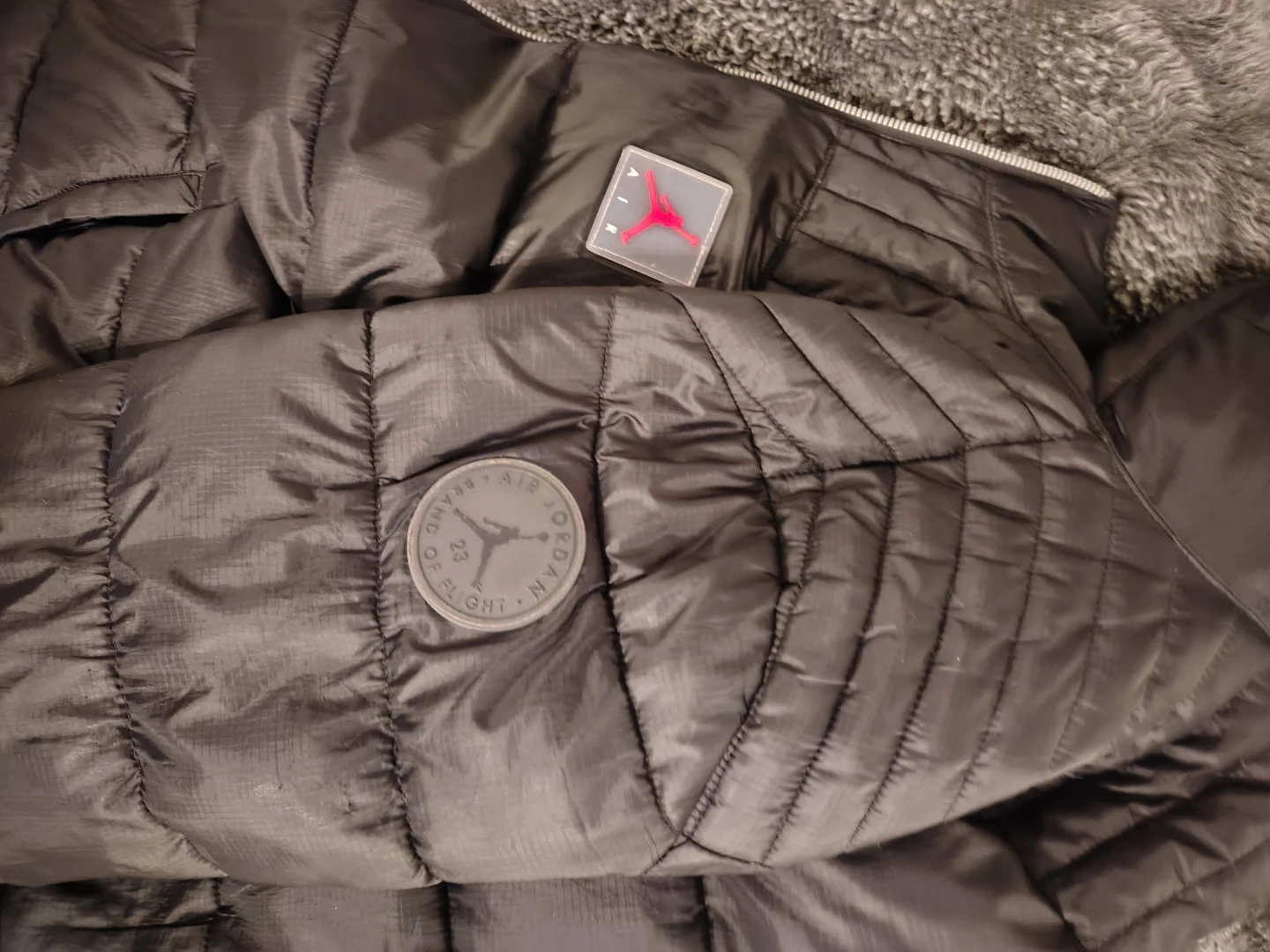 Black Jordan puffer jacket with fleece lining. Features "AIR JORDAN" detailing on the hood. Size XL for kids. Made in Vietnam.