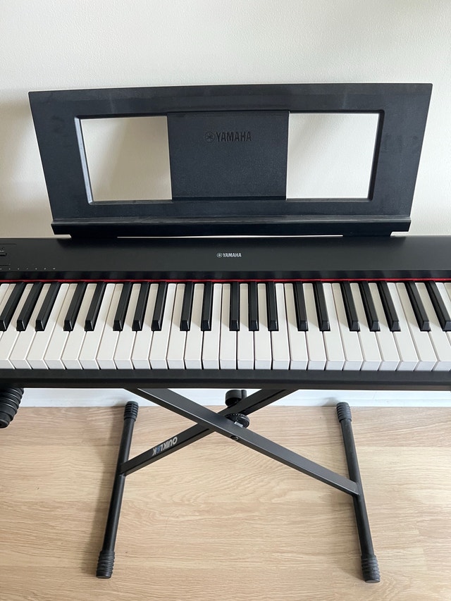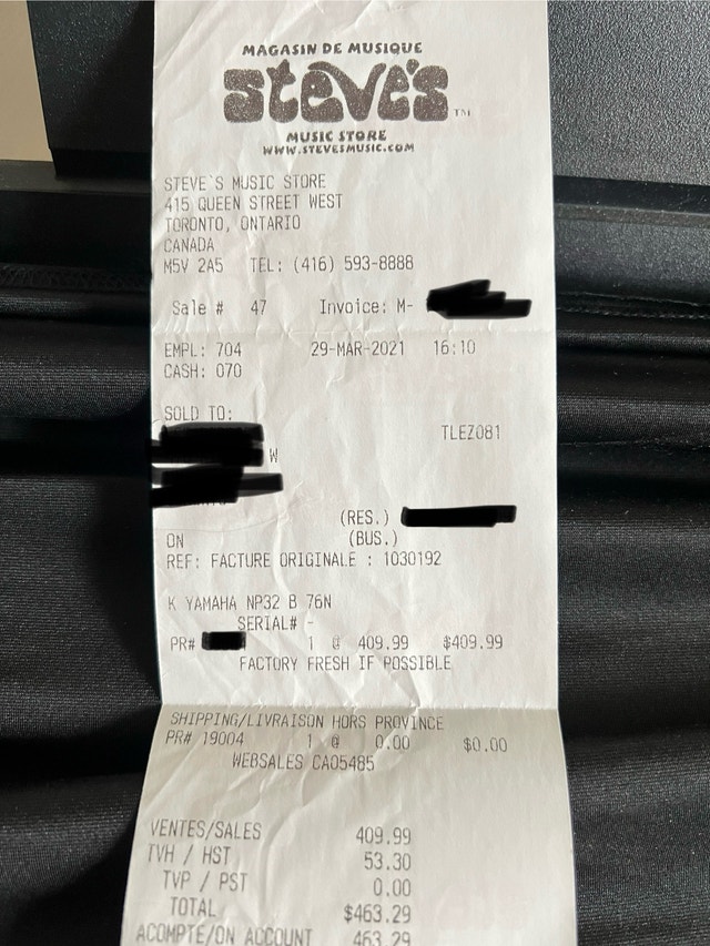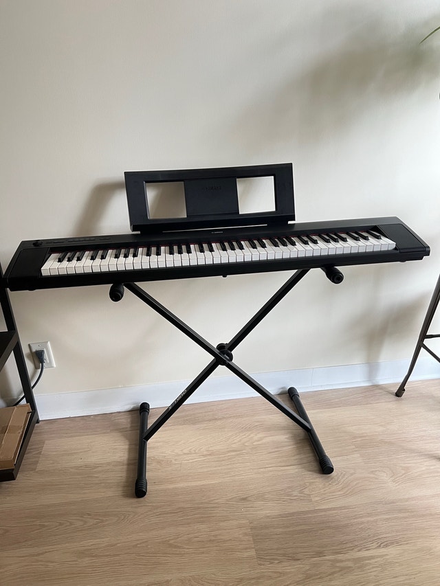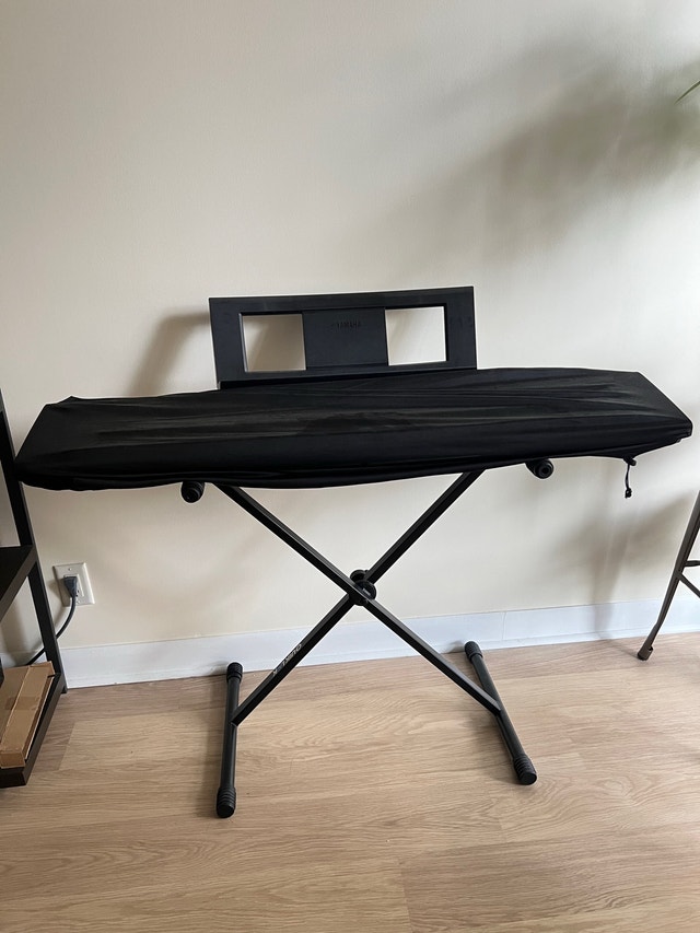 Bought this Yamaha Piaggero NP-32B 76 key portable piano keyboard during covid lockdown as a hobby but didn’t use it very much. I used it about 10 times. It has not been touched for years. It is in brand new pristine condition. It comes with an adjustable stand and cover. Everything was purchased from Steve’s music store on Queen St. I have the original box and packaging as well as the receipts. Mine was purchased for $409.99 total $463.29 Quiklok stand purchased for $39.99 Gator cover $23.99 Total $72.30 Must pick up at King & Spadina. Upon meeting, you can inspect all items. You can take the keyboard out of the box and plug it in to ensure it works in my lobby. Keyboard weight is 12 lbs.