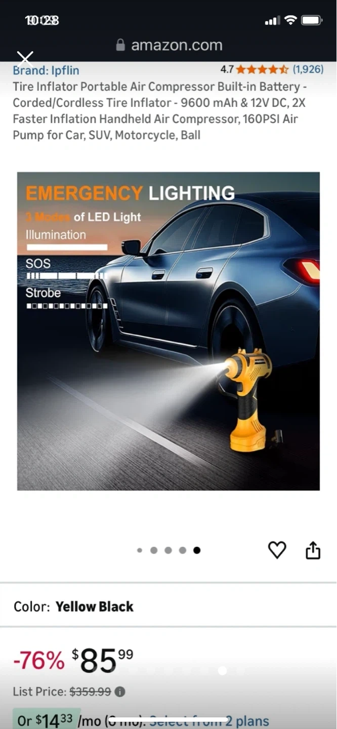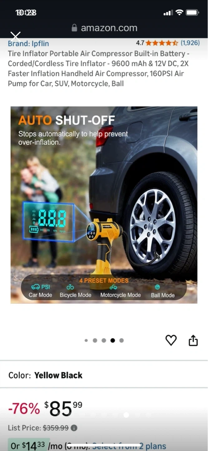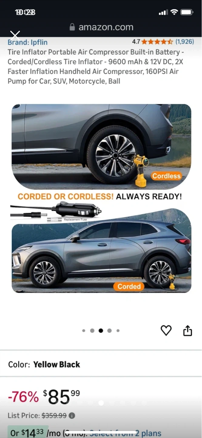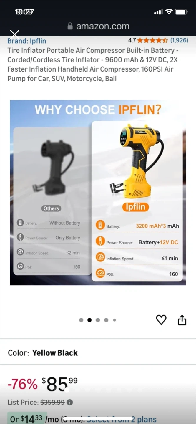 This is a yellow and black portable tire inflator. It features a 3200 mAh battery with 12V DC power. Inflates car tires in under 1 minute.