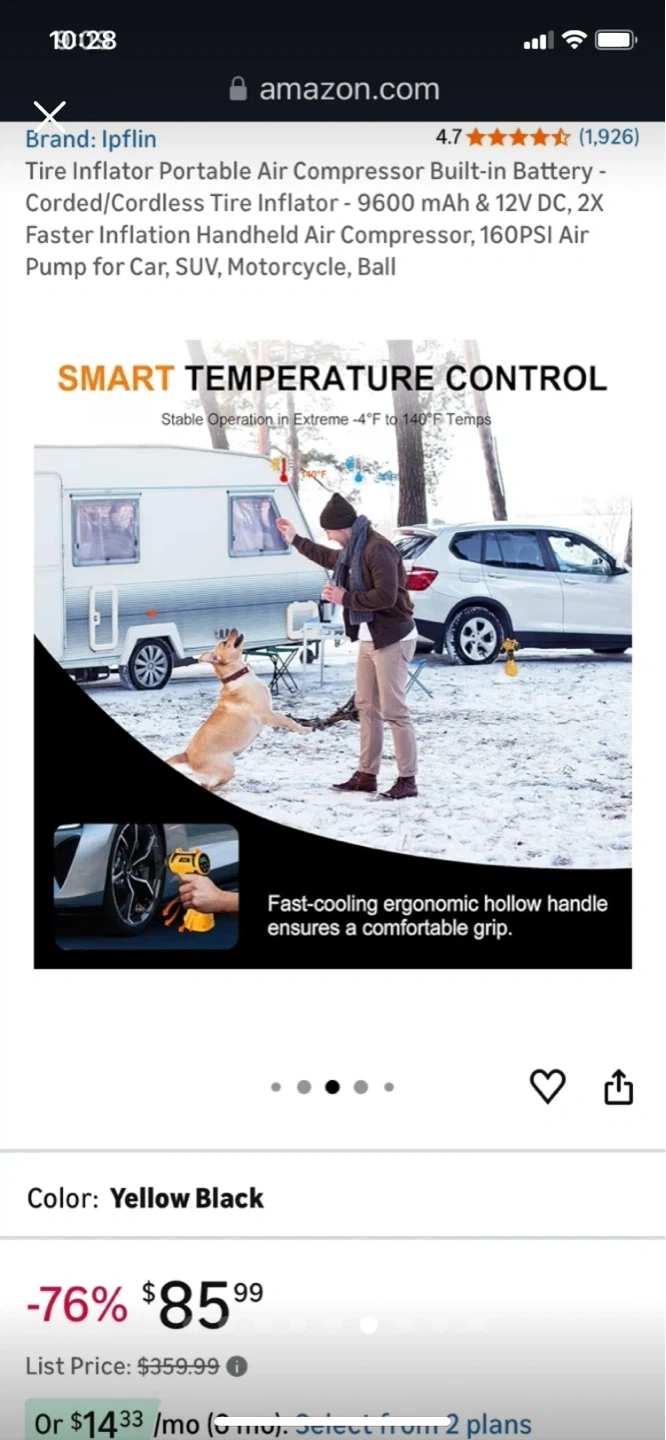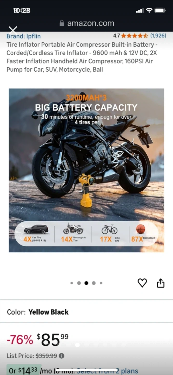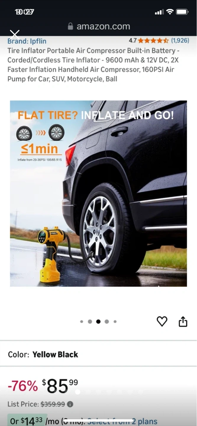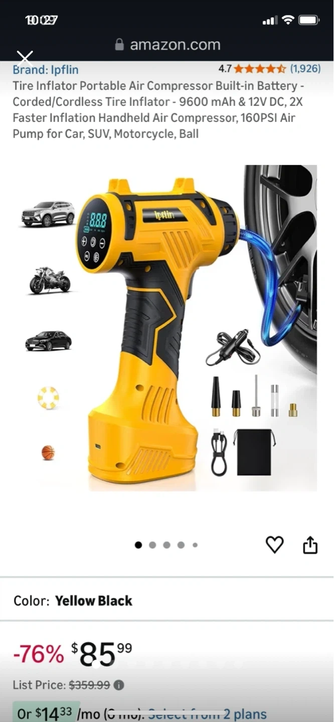 This is a yellow and black portable tire inflator. It features a 3200 mAh battery with 12V DC power. Inflates car tires in under 1 minute.