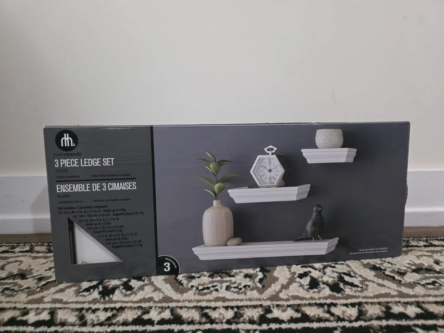This set includes three white ledge shelves. The largest shelf is 18 inches wide and holds up to 9 lbs. The medium shelf is 9 inches wide and holds up to 4.5 lbs. The smallest shelf is 6 inches wide and holds up to 3 lbs. Mounting hardware is included.