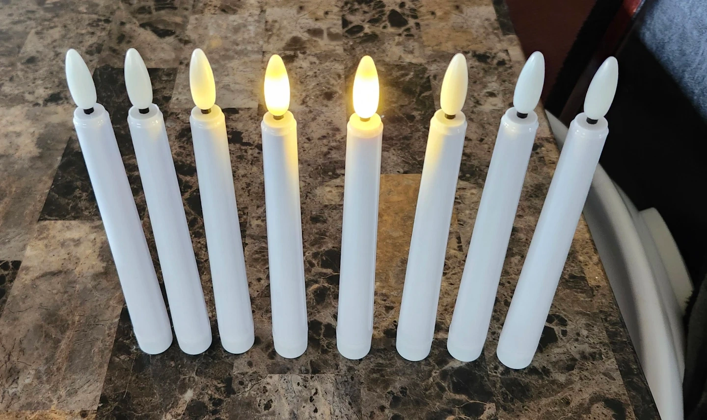 This set includes eight white LED flameless taper candles. Two remote controls are provided for operation. They offer adjustable brightness and timer functions for convenience.