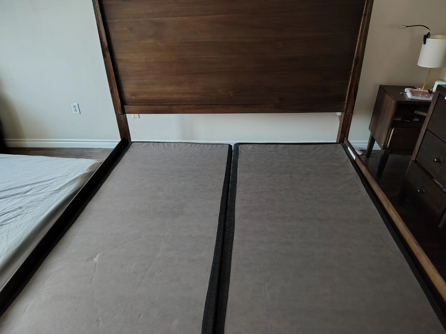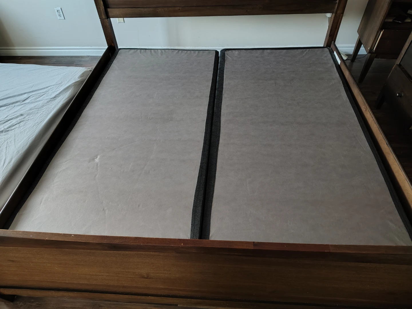 A sturdy wooden bed frame featuring a rich, dark wood finish and a matching headboard. The frame supports two twin-sized box springs side-by-side for a larger sleeping surface. Its simple design fits well with various bedroom decors.
