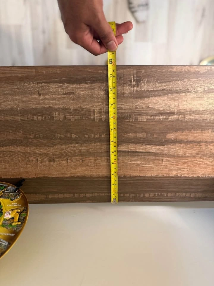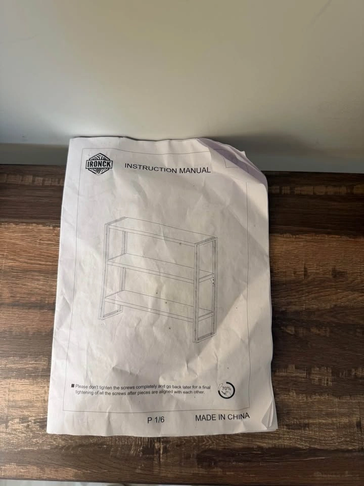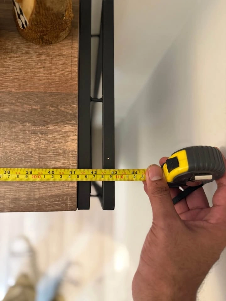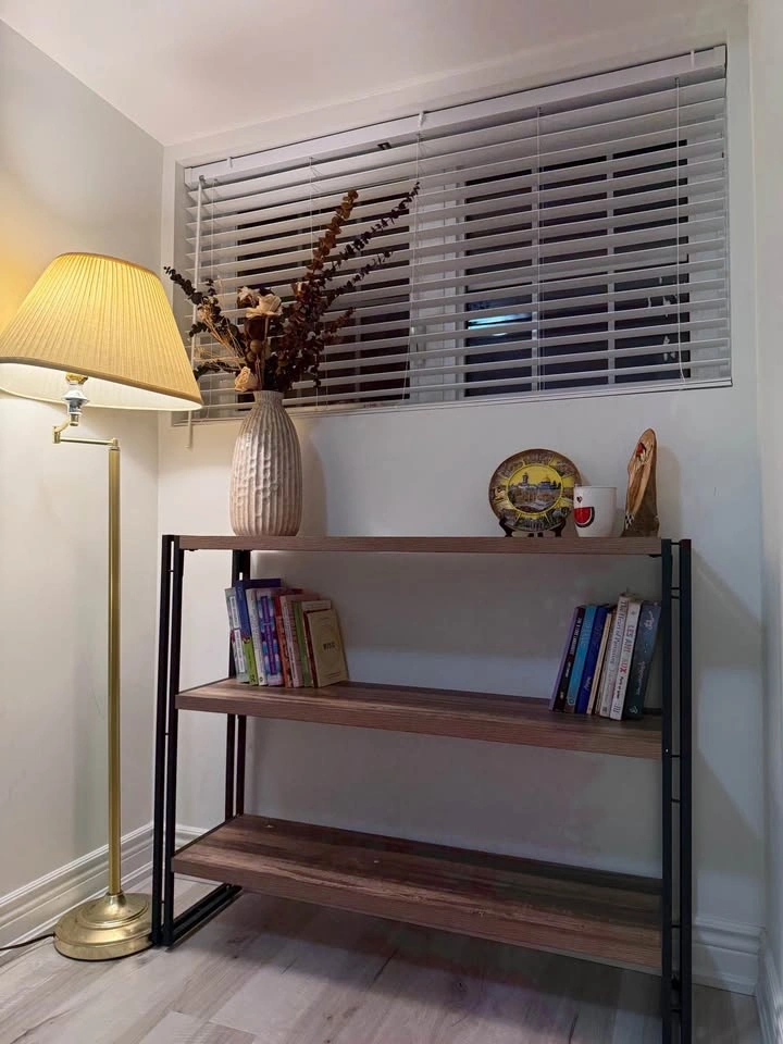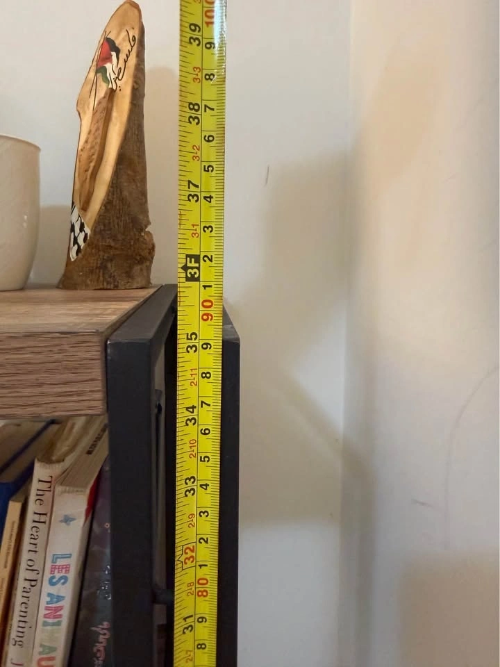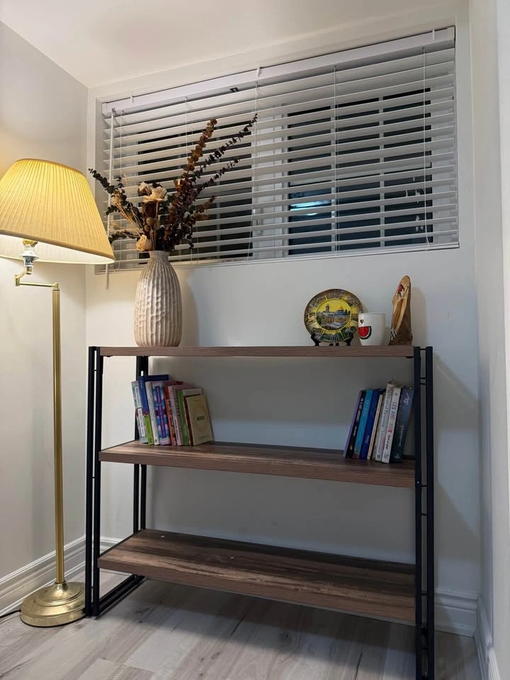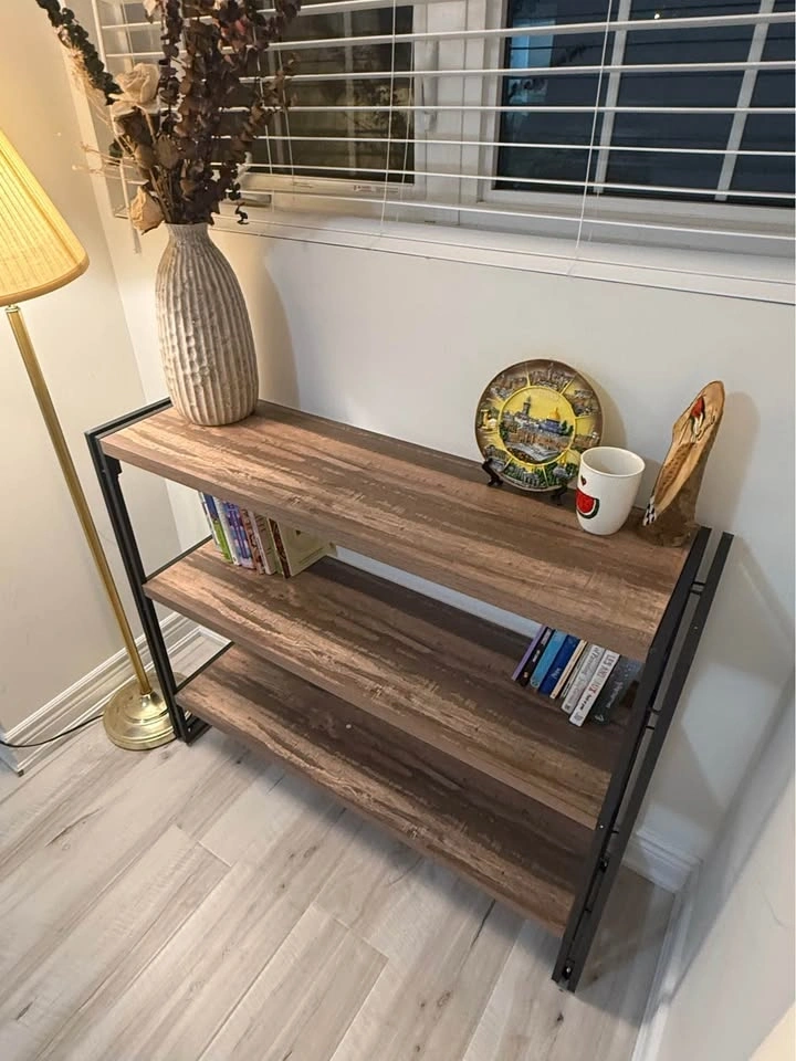 Sturdy 3-tier bookshelf with a black metal frame and dark walnut wood-grain finish shelves. This industrial style unit is open-back and also works as a console table. It's brand new with no scratches or marks. We're downsizing and don't have space for it. Originally purchased from Wayfair. Dimensions are 12" depth x 43" length x 35" height. Asking $130 OBO.