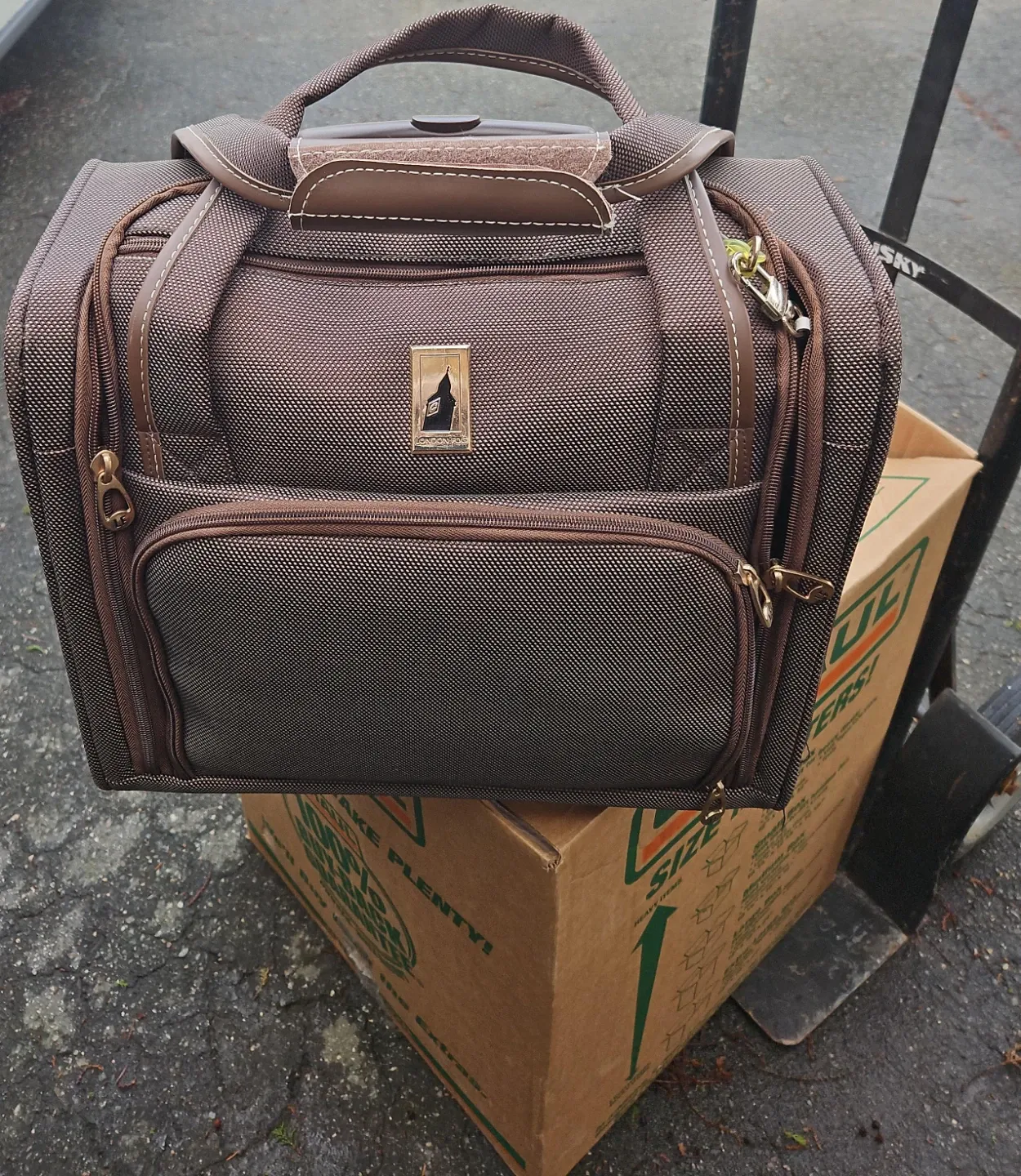 This London Fog carry-on bag features a textured brown exterior with brown faux leather trim. It has a retractable handle and wheels for easy transport. Multiple zippered pockets provide ample storage for your travel essentials.