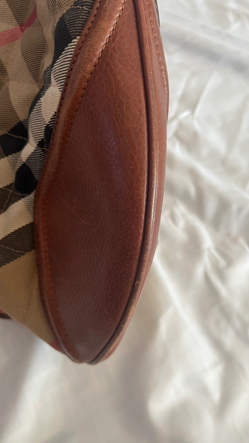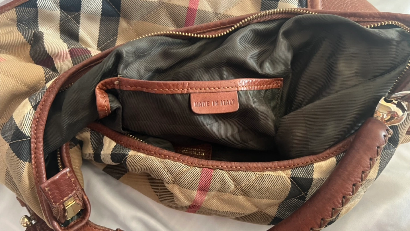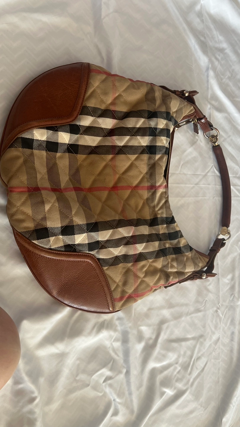 Here's a stylish Burberry handbag featuring the classic Burberry plaid pattern and brown leather accents. It's a quilted design with a zip closure and a comfortable handle. The interior is lined and includes a small pocket. Made in Italy!
