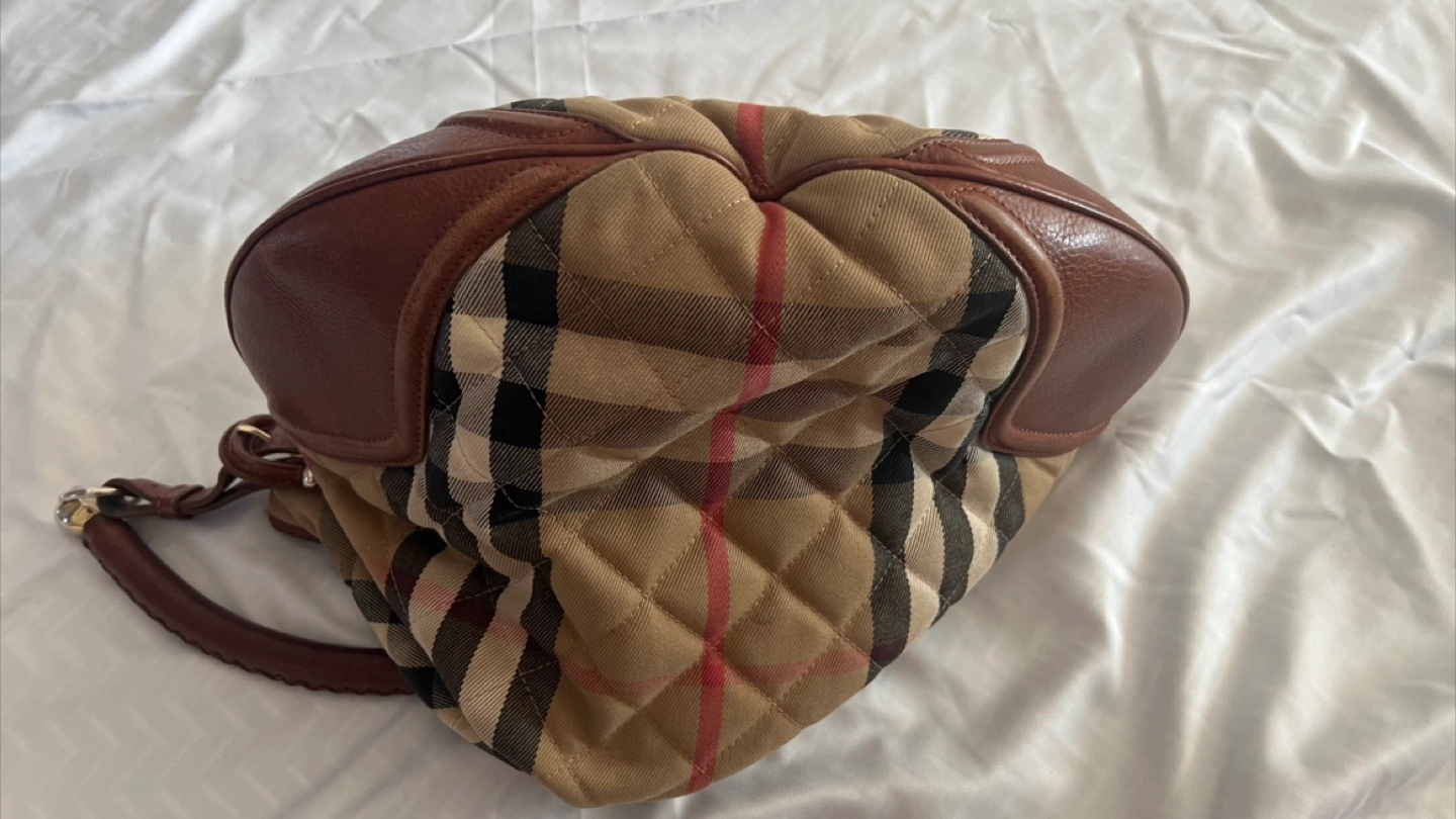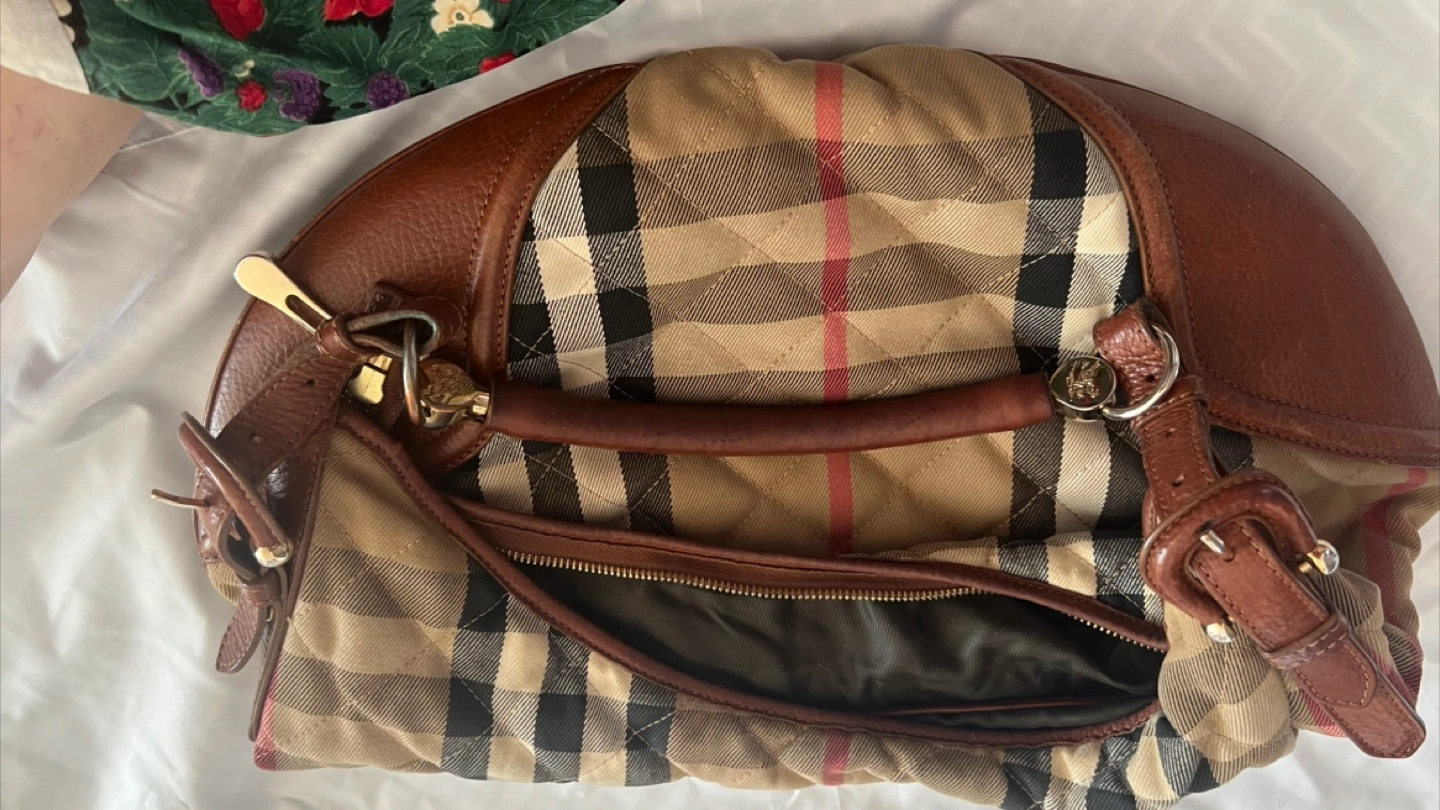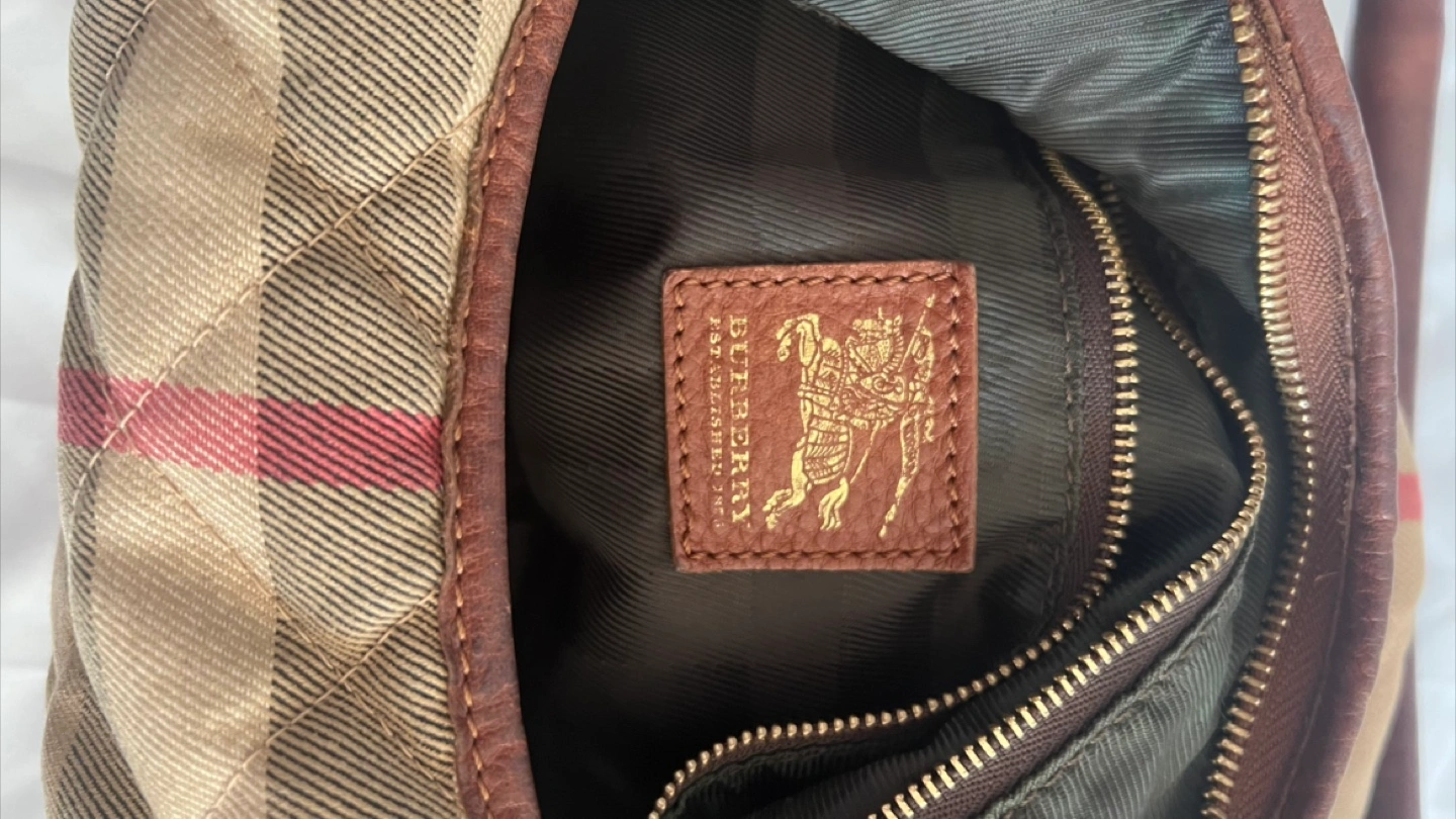 Here's a stylish Burberry handbag featuring the classic Burberry plaid pattern and brown leather accents. It's a quilted design with a zip closure and a comfortable handle. The interior is lined and includes a small pocket. Made in Italy!