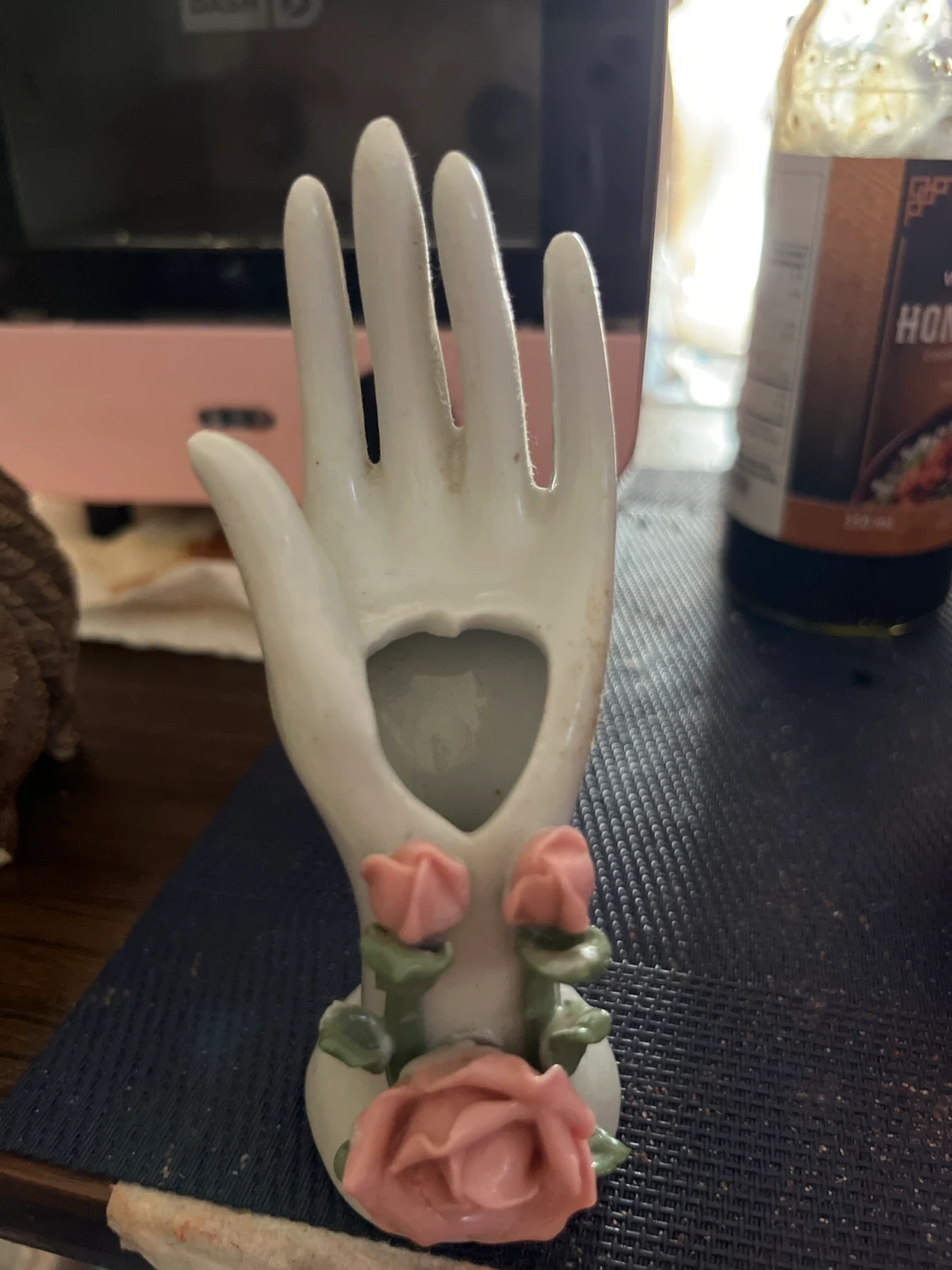 White ceramic hand-shaped trinket dish. Features a heart-shaped cutout in the palm and decorative pink roses at the base. Measures approximately 5 inches tall. Useful for storing rings or small jewellery!