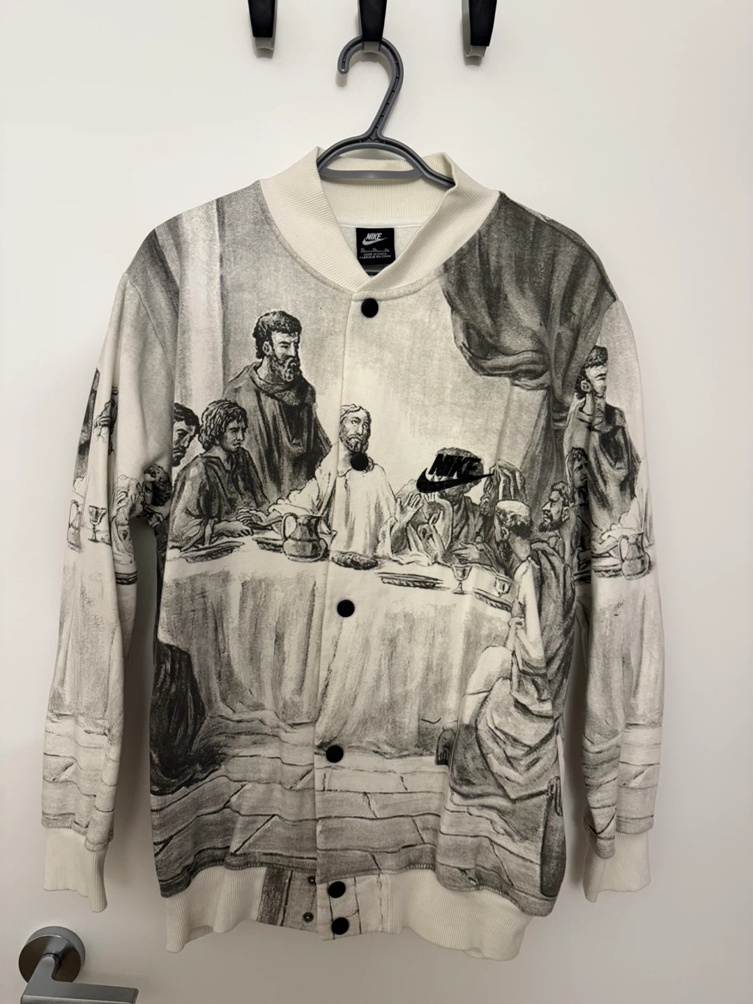 Unique Nike jacket featuring a Renaissance “Last Supper” style artwork printed across the entire piece. Very eye-catching design with snap button closure and ribbed collar.